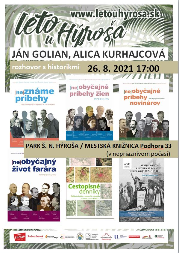 Pozývame na diskusiu s historikmi Alicou Kurhajcovou a Jánom Golianom. Podujatie je záverečným literárnym podujatím mestského kultúrneho leta - Leta u Hýroša.