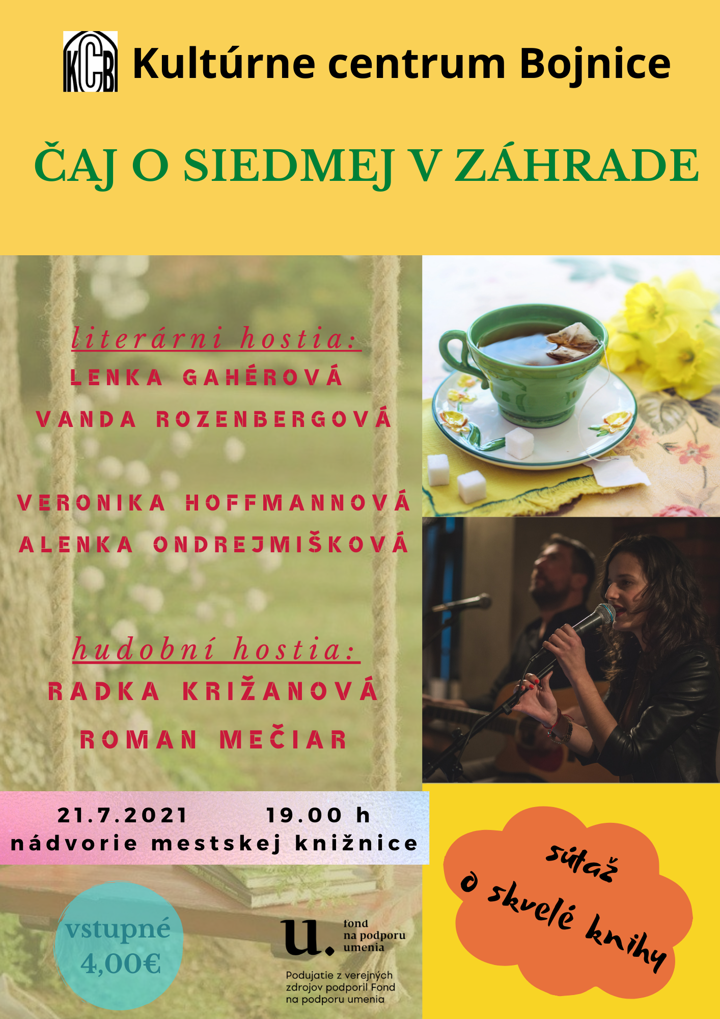 Čítanie z dobrých kníh so skvelými autorkami Lenkou Gahérovou a Vandou Rozenbergovou a s populárnymi hudobnými hitmi v podaní Radky Križanovej a Romana Mečiara Vám spríjemní stredňajší večer v záhrade knižnice. Pre divákov je pripravená súťaž o krásne knihy pozvaných autoriek aj mnohé ďalšie. Osviežite sa ľadovým čajom. Tešíme sa na Vás .