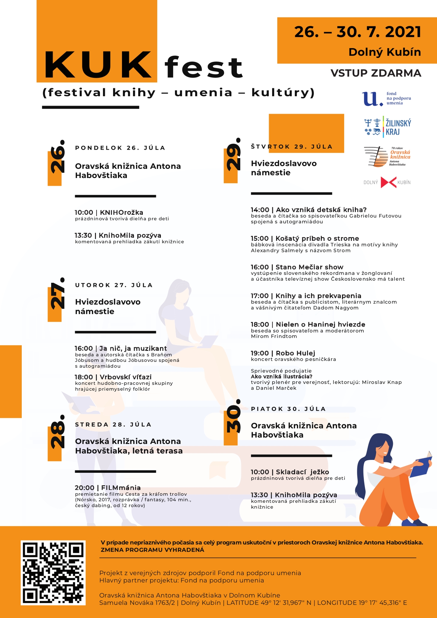 Letný knižný festival predstaví knižnicu ako moderný multikultúrny priestor. Celý týždeň sa bude niesť v znamení kníh, autorského čítania, knižných tvorivých dielní, dobrej hudby, ale na svoje si prídu aj milovníci fantasy a nájde sa niečo aj pre najmenších divadelných fanúšikov. Chceme zároveň s knižnicou vyjsť medzi ľudí a priniesť kultúru pod šíre nebo.