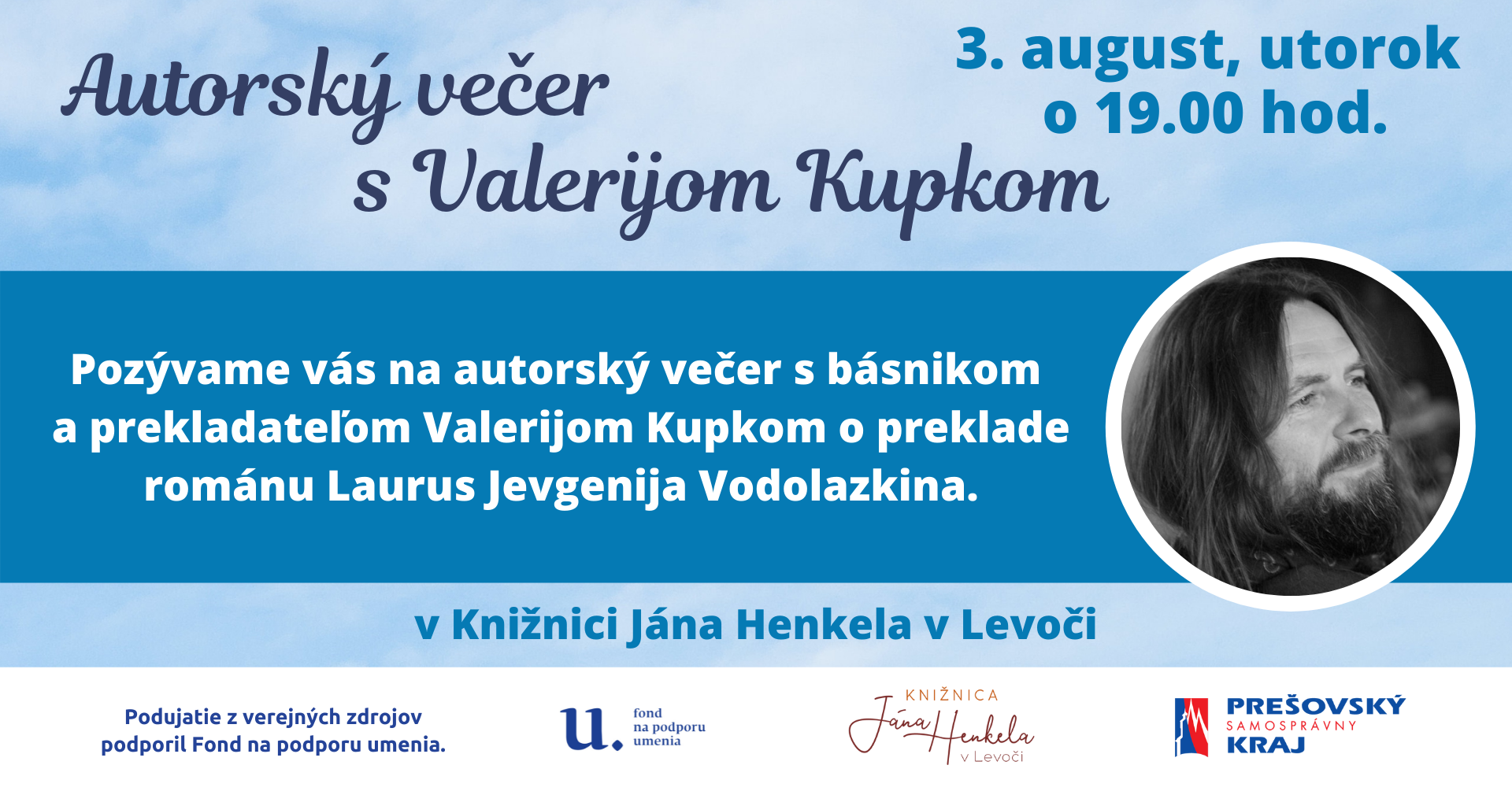 Pozývame vás na autorský večer s básnikom a prekladateľom Valerijom Kupkom o preklade románu Laurus Jevgenija Vodolazkina. V Knižnici Jána Henkela v Levoči.