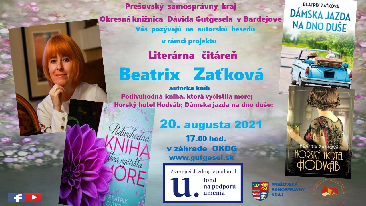 Literárna čitáreň zameraná na súčasných slovenských autorov prostredníctvom osobného stretnutia v Okresnej knižnici Dávida Gutgesela v Bardejove. Beatrix Zaťková - autorka kníh Podivuhodná kniha, ktorá vyčistila more, Horský hotel Hodváb, Dámska jazda na dno duše