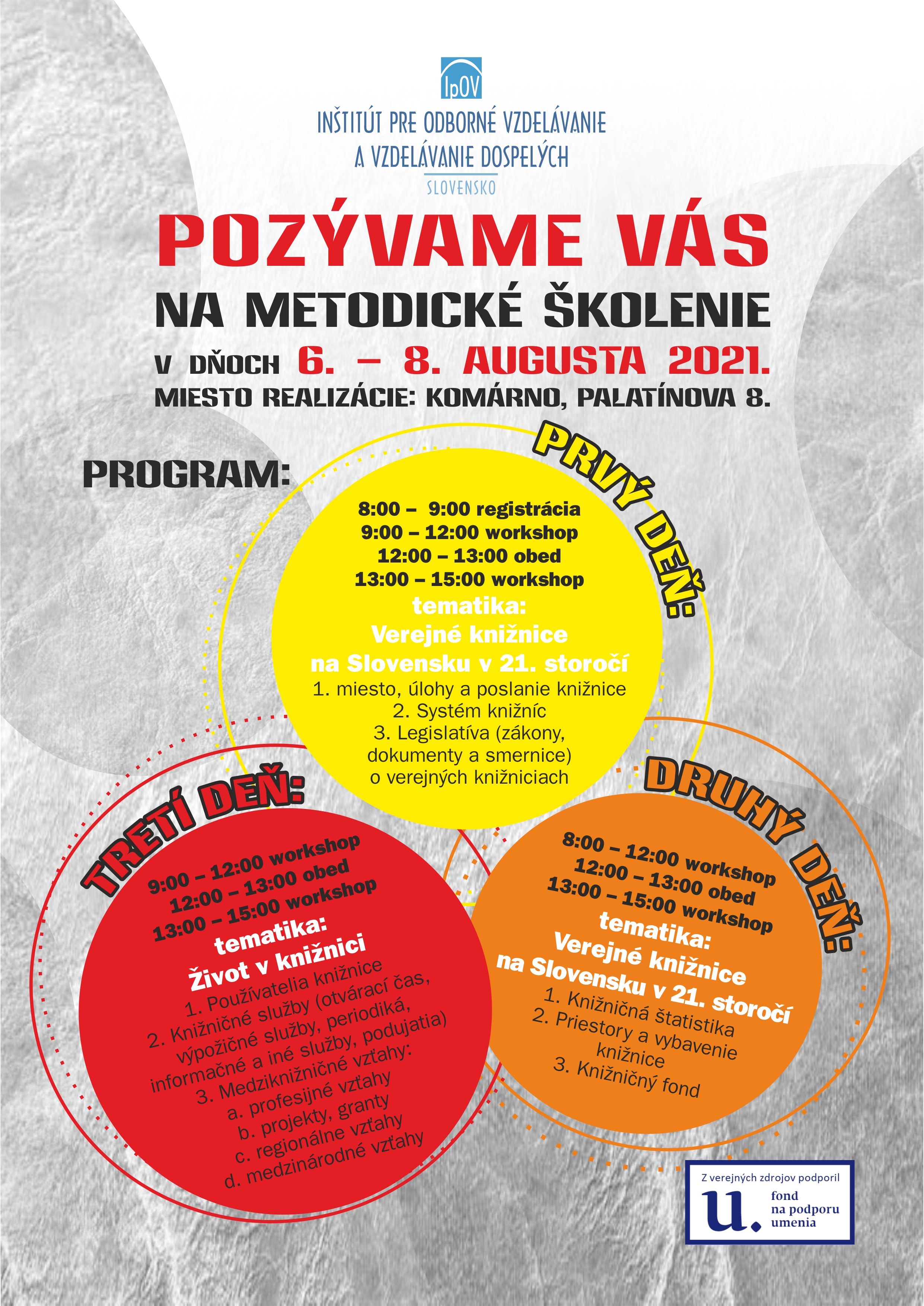 Účastníci si v rámci školenia osvojili základné prvky teórie a praxe tvorby knižničných podujatí (komunikácia, marketing, vytvorenie programového plánu, propagácia, rozpočet). Cieľovou skupinou boli knihovníci z rôznych obcí Slovenska. V rámci programu sa knihovníci oboznámili s užitočnými príkladmi podujatí, tak ich budú vedieť vo svojej obci neskôr uplatniť. V menších obciach zodpovedajú za knižničné služby v značnej miere kultúrni referenti, ktorí budú vedieť zužitkovať získané vedomosti.