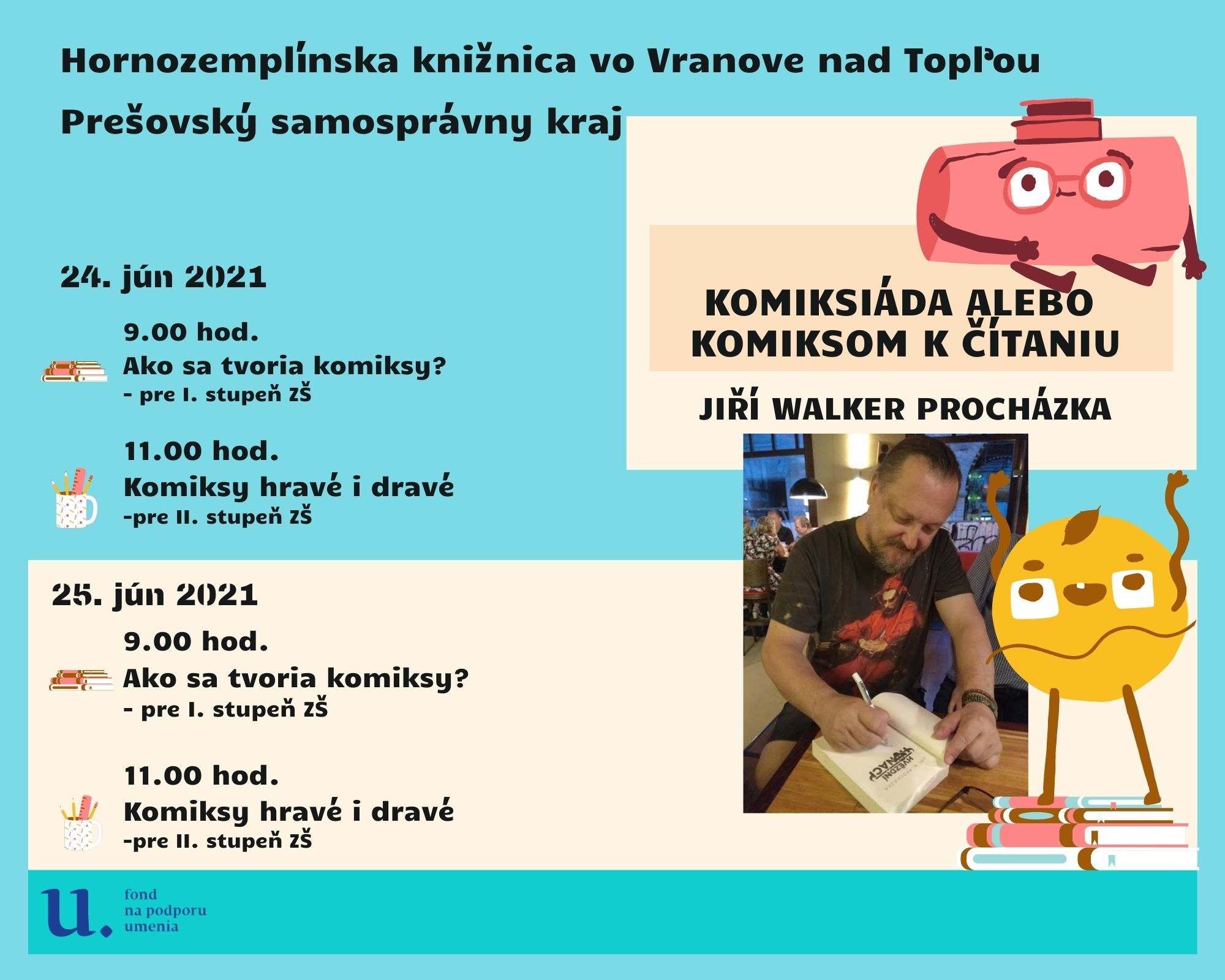 Hornozemplínska knižnica a Prešovský samosprávny kraj vás srdečne pozývajú na Komiksové workshopy, ktoré sa uskutočnia od 24.6.2021 - 25.6.2021 v Honrozemplínskej knižnici. Lektorom workshopov bude: Jiří Walker Procházka