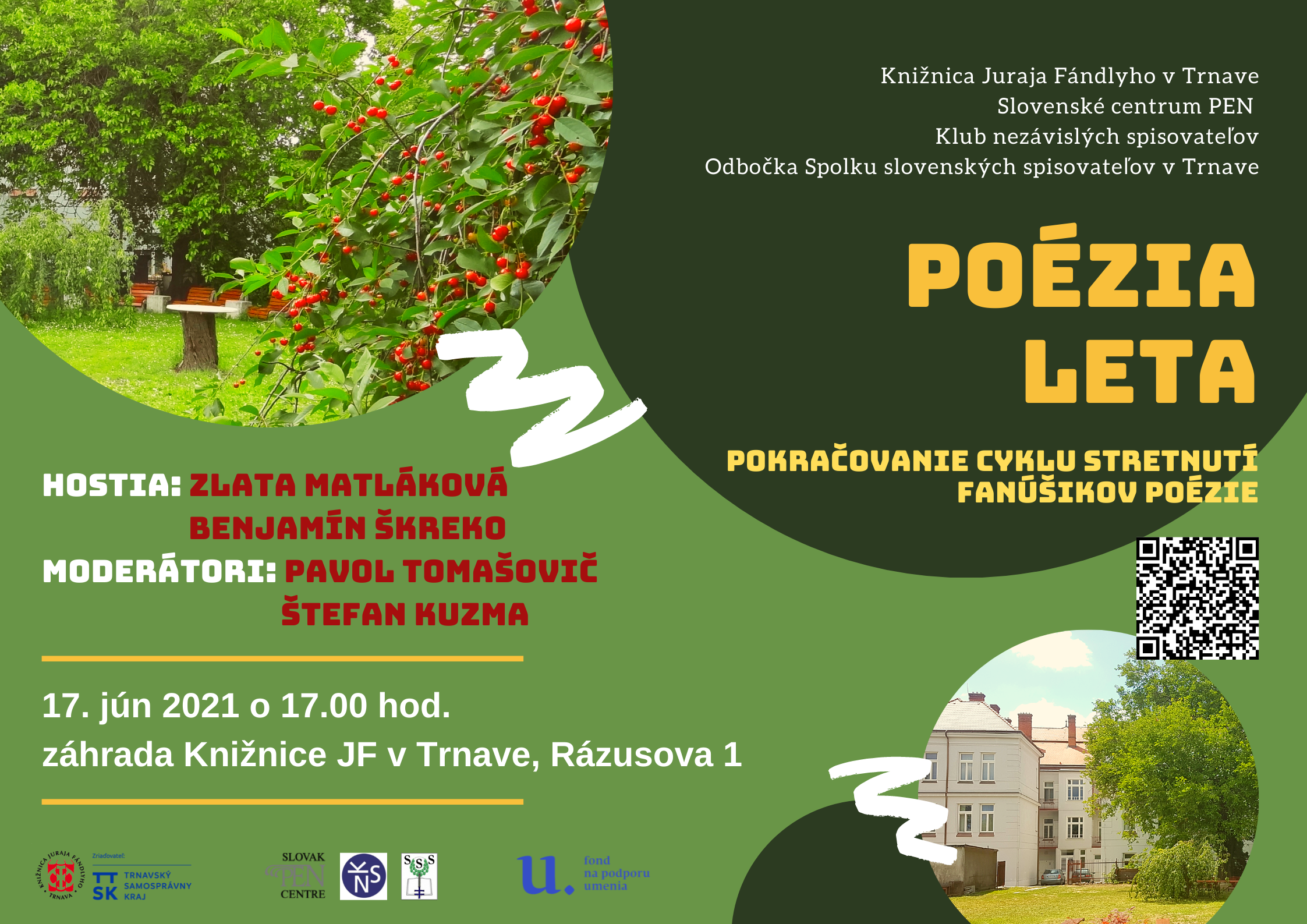 Pokračovanie cyklu stretnutí fanúšikov poézie Trnavská poetika. 5. ročník. Privítame dvoch hostí - poetku Zlatu Matlákovú a básnika, dramatika Benjamína škreka. Podujatie spoločne moderujú: Pavol Tomašovič a Štefan Kuzma.