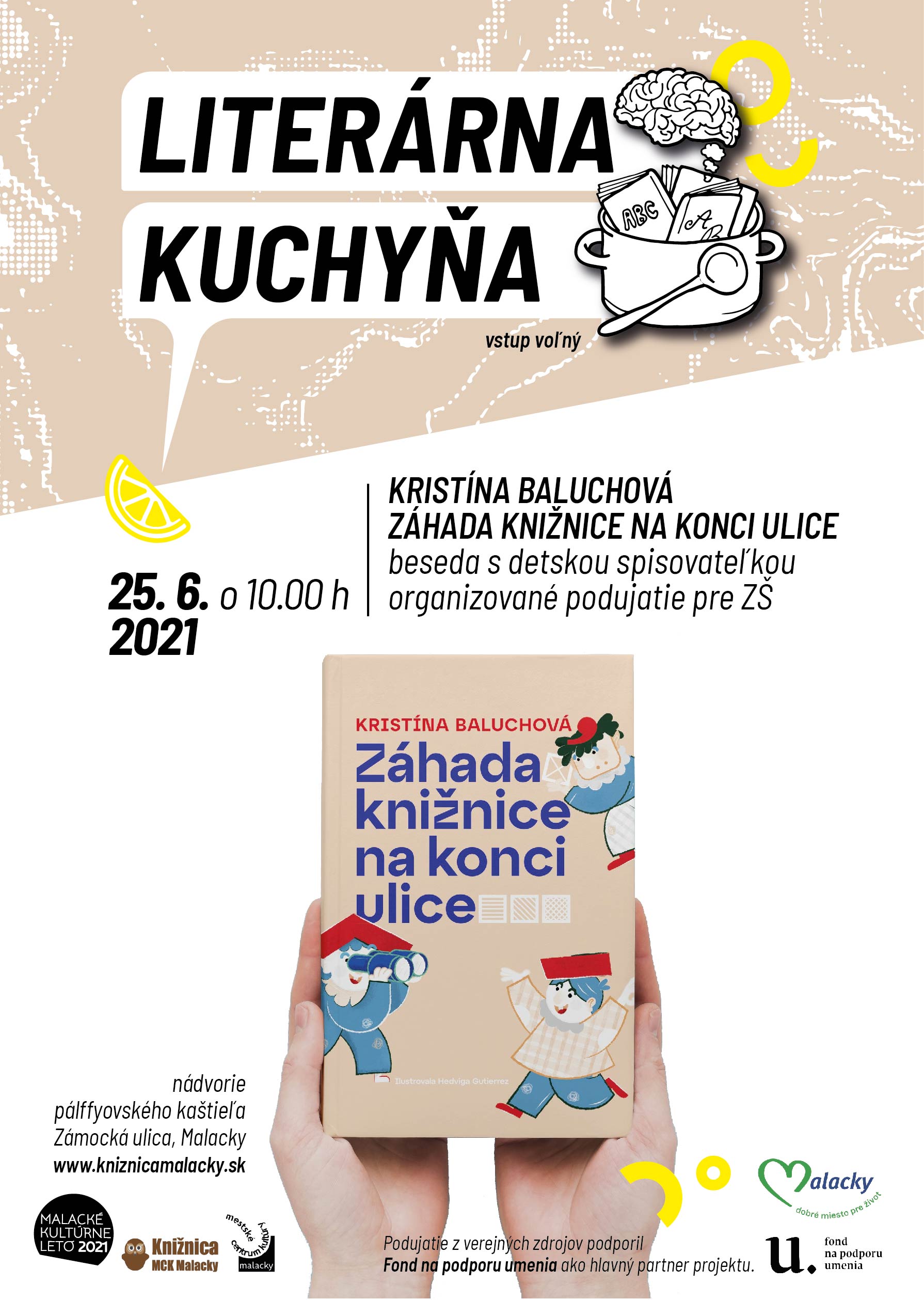 Knižnica MCK Malacky opäť v Literárnej kuchyni namieša ďalšiu výchovno-vzdelávaciu kašu, ktorá podporuje čitateľskú gramotnosť, čiže trávenie kníh u detí a mládeže a ich záujem o literatúru. Pripravili sme pre žiakov organizované stretnutie so spisovateľkou Kristínou Baluchovou. Predstaví nám svoju najnovšiu knižku Záhada knižnice na konci ulice, kde po prečítaní si všetci uvedomia, aká sila sa naozaj skrýva v čítaní.