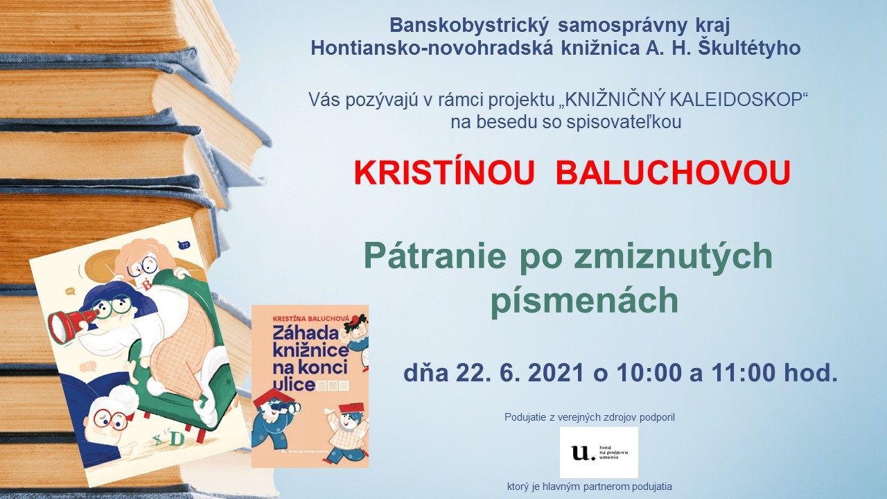 Autorská beseda so spisovateľkou Kristinou Baluchovou pre deti základných škôl dňa 21. 6. 2021 v Trinástej komnate knižnice so začiatkom o 10,00 a 11,30 hod.