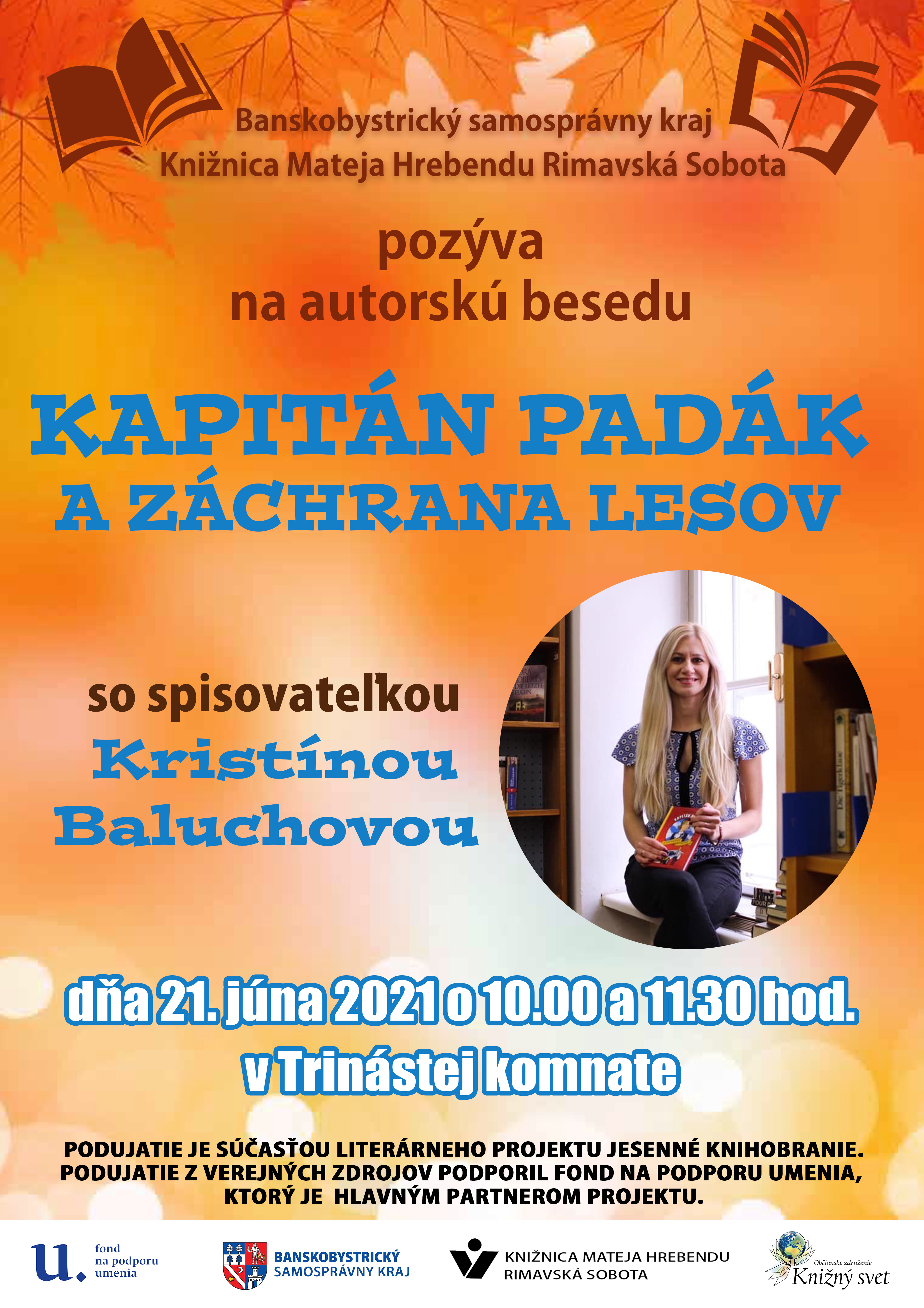 Beseda so spisovateľkou Kristínou Baluchovovu je venovaná žiakom ZŠ. Okrem rozprávaní o zaujímavých príbehoch kapitána Padáka bude spisovateľka čítať z jej najnovšej knihy - Záhada knižnice na konci ulice.