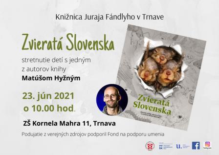 Stretnutie detí s Matúšom Hyžným, s jedným z autorov encyklopédie Zvieratá Slovenska v rámci cyklu Kniha a ešte trochu viac. Podujatie sa koná v ZŠ, Ul. Kornela Mahra v Trnave o 10.00 hod.