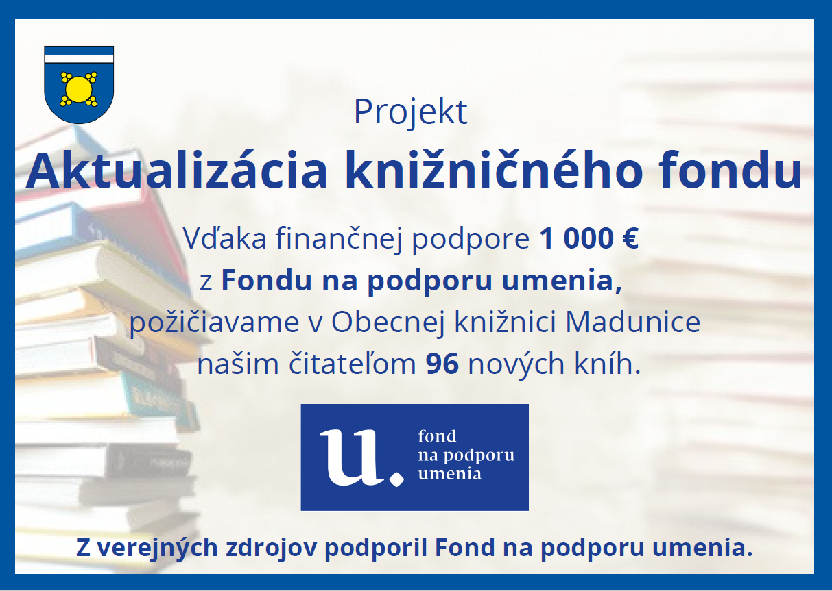 Vďaka finančnej podpore 1 000 € z Fondu na podporu umenia, požičiavame v Obecnej knižnici Madunice našim čitateľom 96 nových kníh.