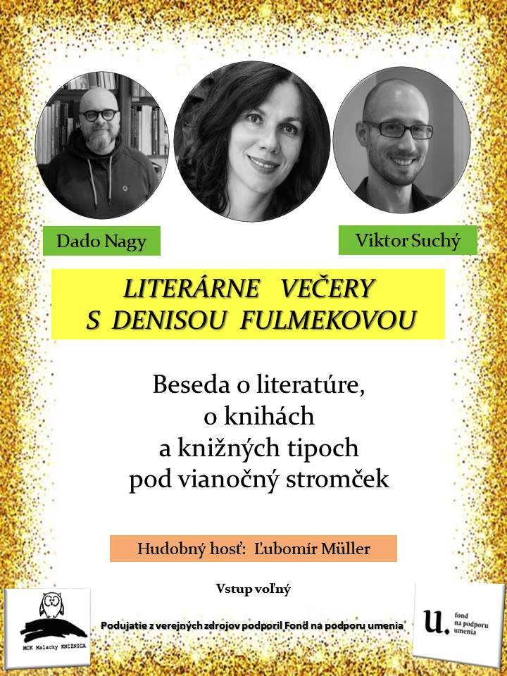 Spisovateľka s malackými koreňmi sa bude rozprávať so svojimi špeciálnymi hosťami – Dadom Nagyom a Viktorom Suchým o literatúre, knihách a knižných tipoch pod vianočný stromček. Večerom nás bude sprevádzať hudobný hosť Ľubomír Müller.