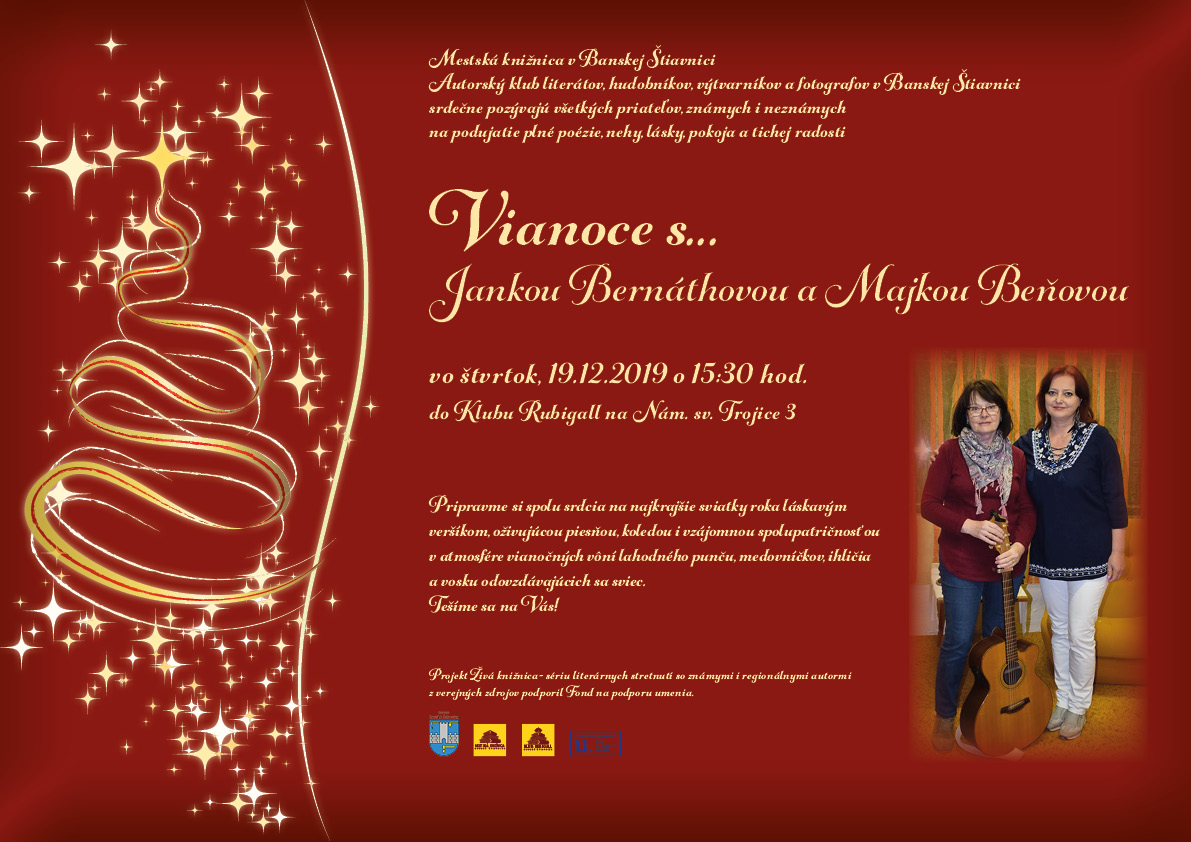 Predvianočné stretnutie s obľúbenou banskoštiavnickou autorkou, ktorá už dávno prerástla hranice regiónu- Jankou Bernáthovou- Lehotskou a jej nežnou poéziou doplnenou podmanivou gitarovou hudbou Majky Beňovej, ktorá vynikajúco dopĺňa atmosféru veršov.