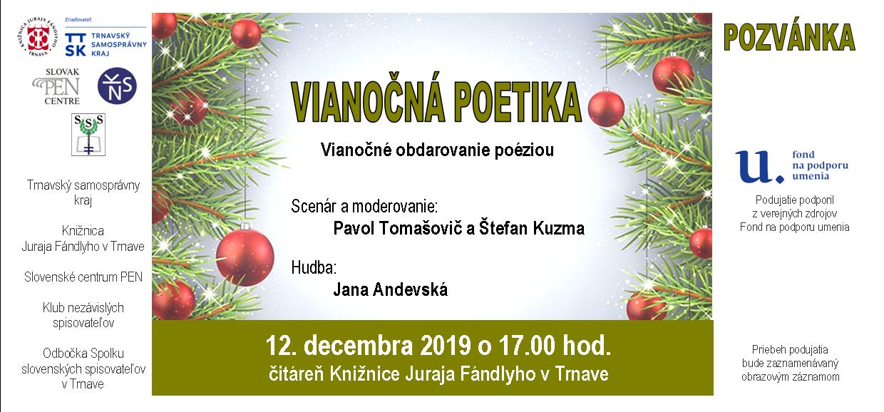 Vianočné obdarovanie poéziou. Scenár a moderovanie: Pavol Tomašovič a Štefan Kuzma, hudba: Jana Andevská