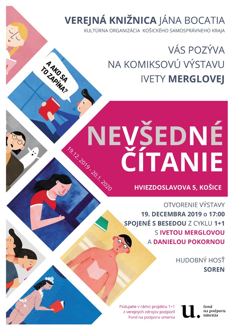 Verejná knižnica Jána Bocatia v Košiciach, kultúrne zariadenie Košického samosprávneho kraja, vás pozýva na otvorenie výstavy oceňovanej českej ilustrátorky Ivety Merglovej, ktoré sa bude konať 19. decembra 2019 o 17:00 v priestoroch centrálnej požičovne na Hviezdoslavovej ul. 5. Na výstave s názvom Nevšedné čítanie budú vystavené originálne ilustrácie, ktoré vznikli na základe spolupráce s portálom Verejnej knižnice Jána Bocatia http://www.knihynadosah.sk