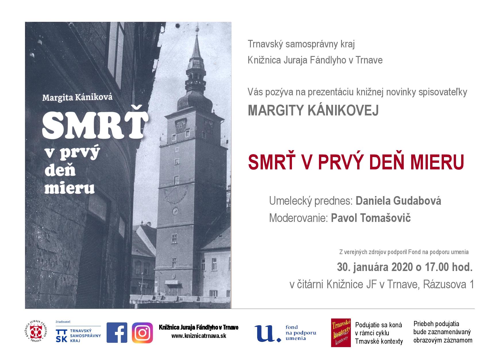 Prezentácia knižnej novinky spisovateľky Margity Kánikovej. Podujatie sa koná v rámci cyklu Trnavské kontexty