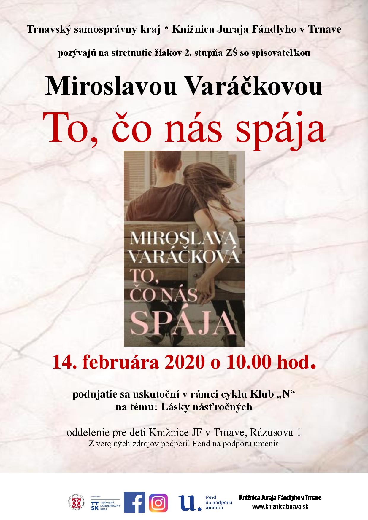 Stretnutie žiakov 2. stupňa ZŠ so spisovateľkou Miroslavou Varáčkovou. Podujatie sa koná v rámci cyklu Klub "N" na tému: Lásky ...násťročných