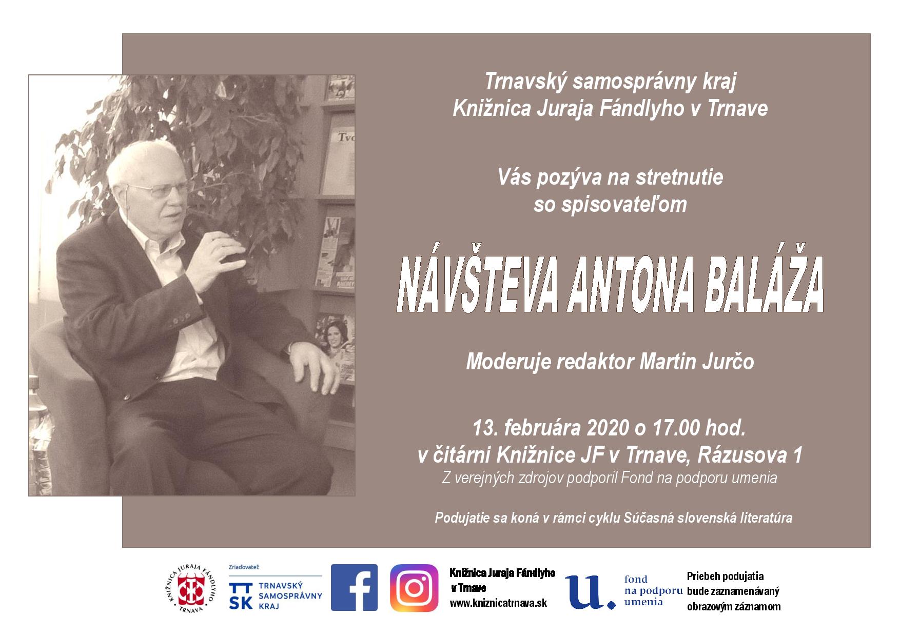 Stretnutie so spisovateľom Anton Balážom moderuje redaktor Martin Jurčo. Podujatie sa koná v rámci cyklu Súčasná slovenská literatúra