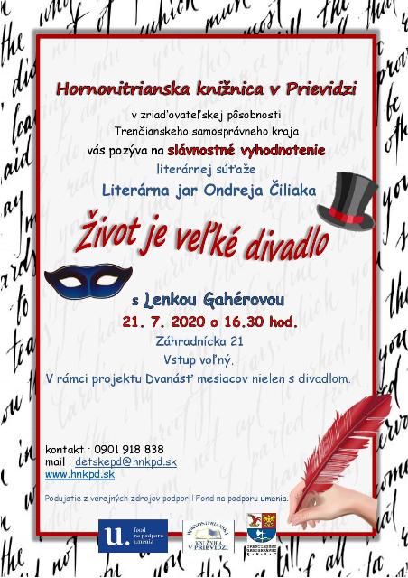Slávnostné vyhodnotenie literárnej súťaže – Literárna jar Ondreja Čiliaka – literárna súťaž v tvorbe poézie a prózy pre deti do 15 rokov, študentov, dospelých i seniorov. Vyhodnotiť príde slovenská spisovateľka pani Lenka Gahérová, autorka kníh pre deti i dospelých, ktorá sa zároveň zhostí aj besedy.