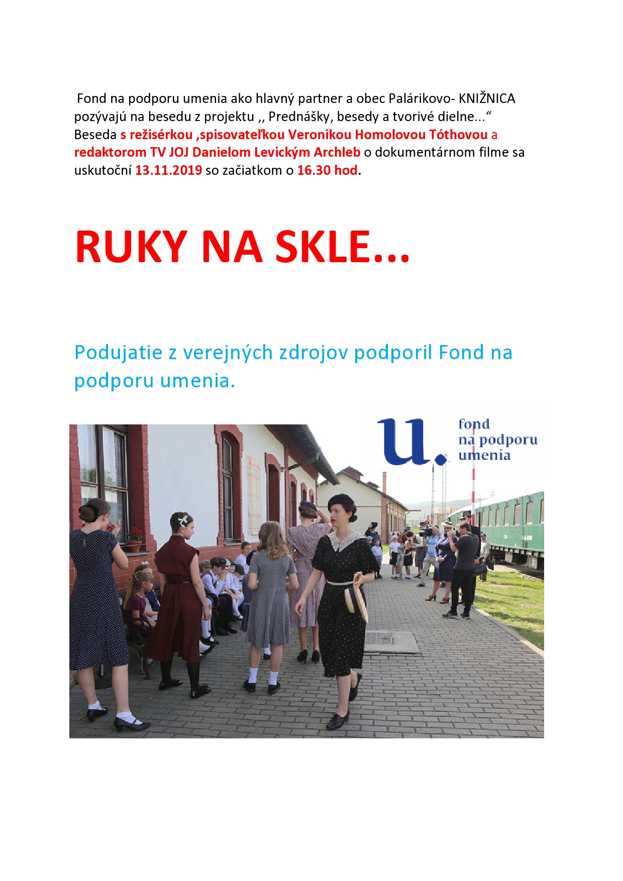Beseda so spisovateľkou a režisérkou Veronikou Homolovou Tóthovou a spoluautorom ,redaktorom TV JOJ Danielom Levickým Archleb sa uskutoční dňa 13. novembra 2019 pod názvom Ruky na skle... so začiatkom o 16.30 hod. v knižnici palárikovo