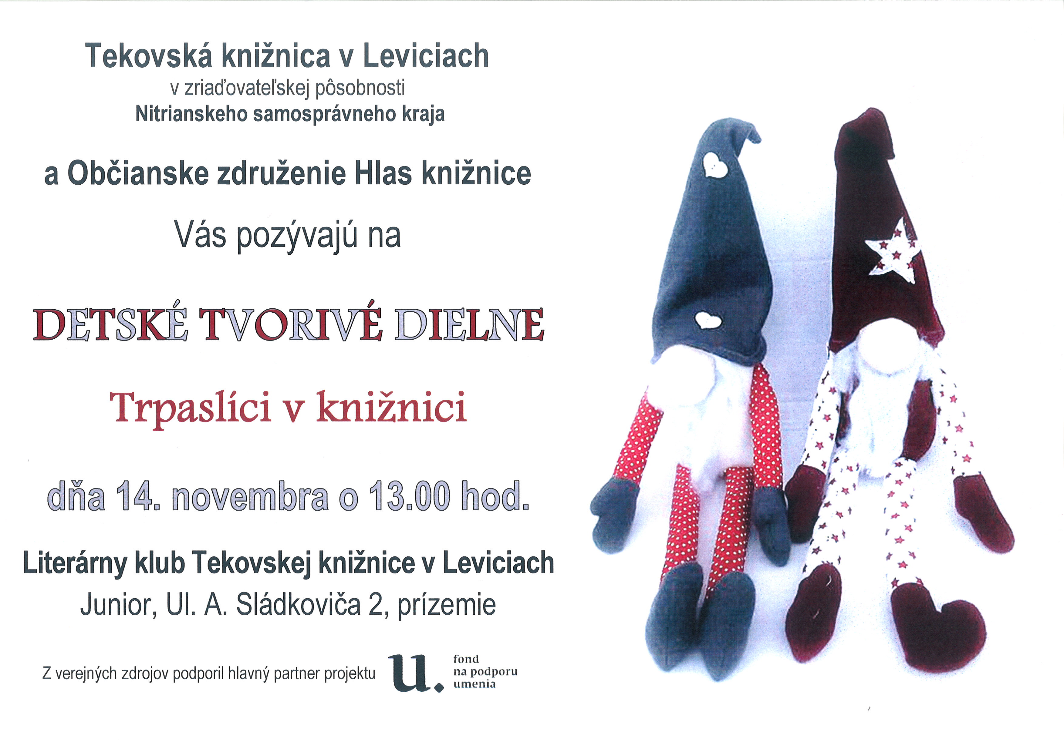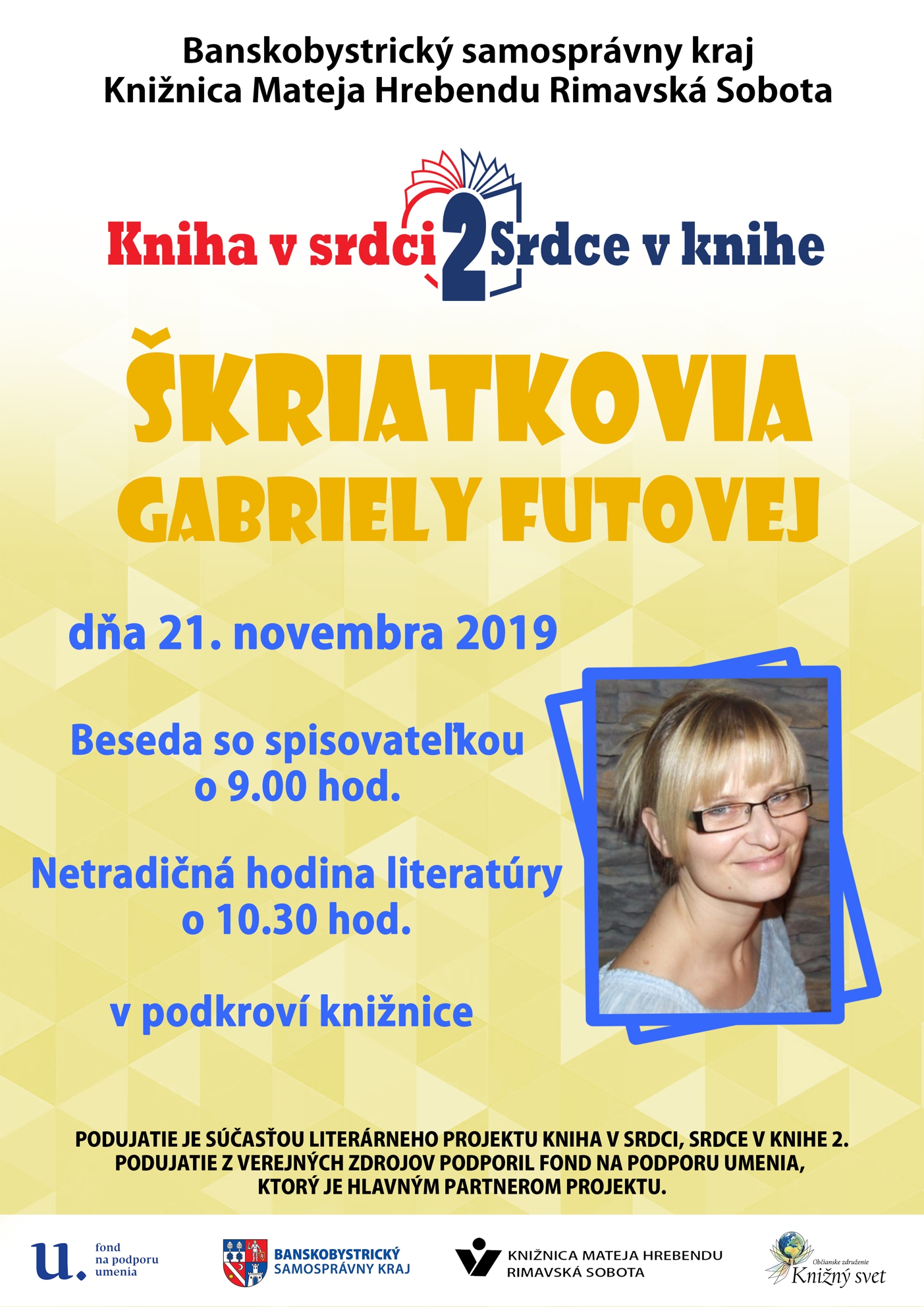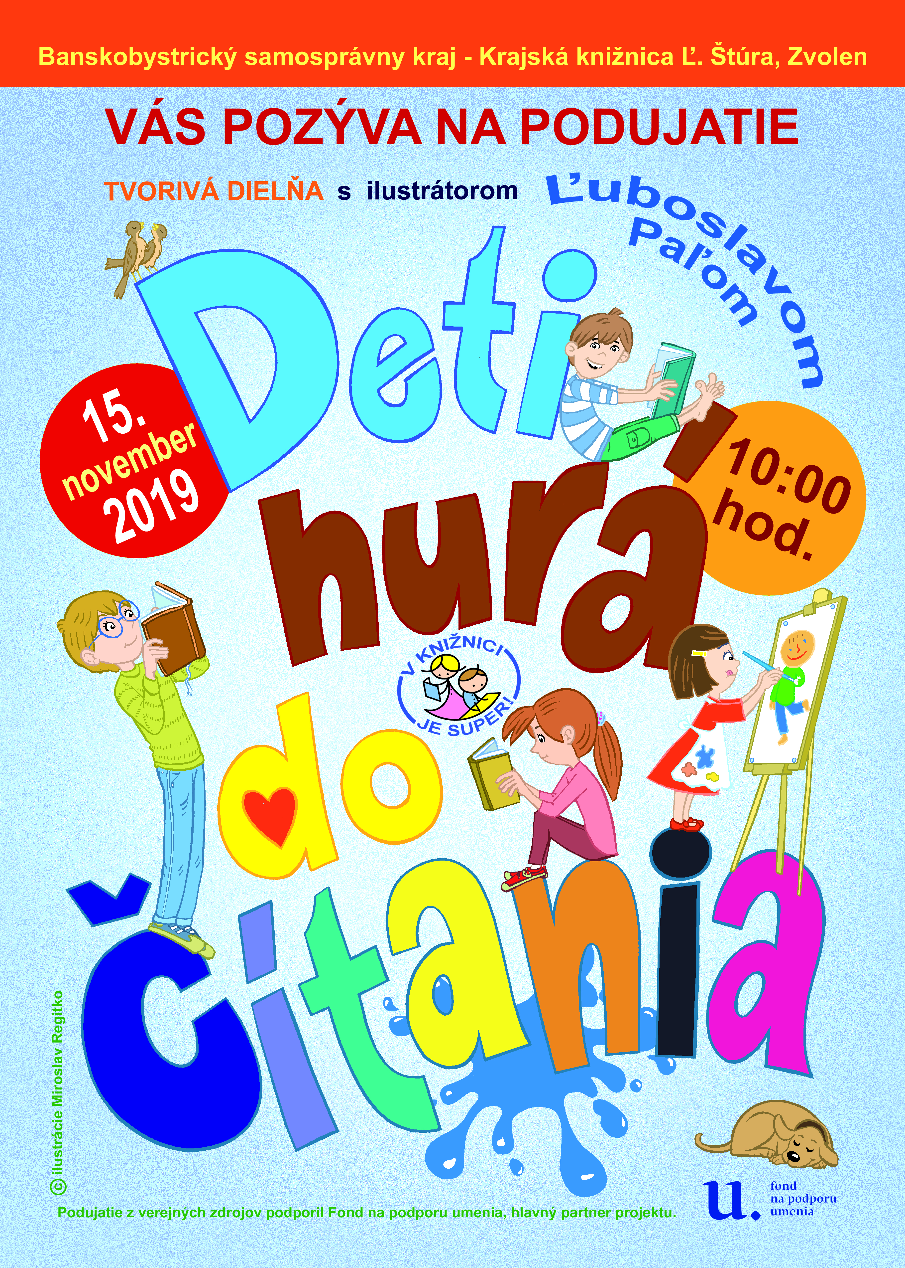 Celoslovenský odborný seminár Knižnica v živote dieťaťa (III. ročník) zameraný na rozvoj čítania a čitateľskej gramotnosti tínedžerov, z verejných zdrojov podporil Fond na podporu umenia. Krajská knižnica v Žiline, dňa 15. 11. 2019 o 8:15 Na podujatie je nevyhnutné sa prihlásiť do 6. 11. 2019 prostredníctvom prihlasovacieho formulára: https://docs.google.com/forms/d/e/1FAIpQLSchmddRm-4i7-H0LBmECU6XvQR6_wnZEeiX8xim7HCq5fawcw/viewform?vc=0&c=0&w=1