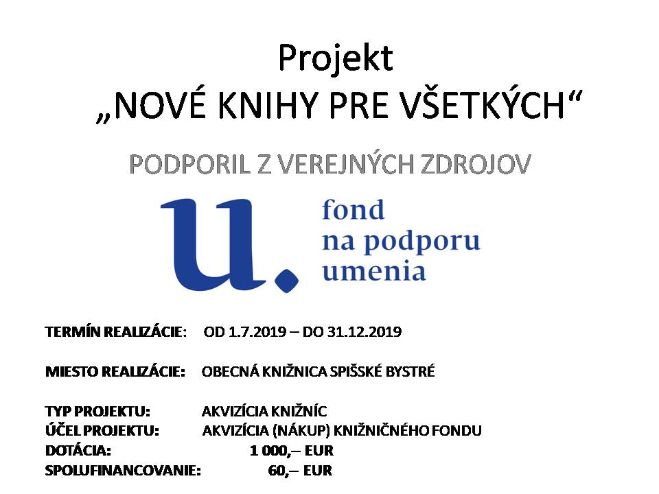Zámerom tohto projektu je modernizácia obecnej knižnice, a to predovšetkým vytvorením centrálneho voľného priestoru, vďaka ktorému by sa podarilo rozšíriť podporné aktivity realizované v našej knižnici a naplniť tak jej hlavné poslanie, a to vytvoriť modernú kultúrno- vzdelávaciu inštitúciu v súlade s trendom dnešnej doby.
