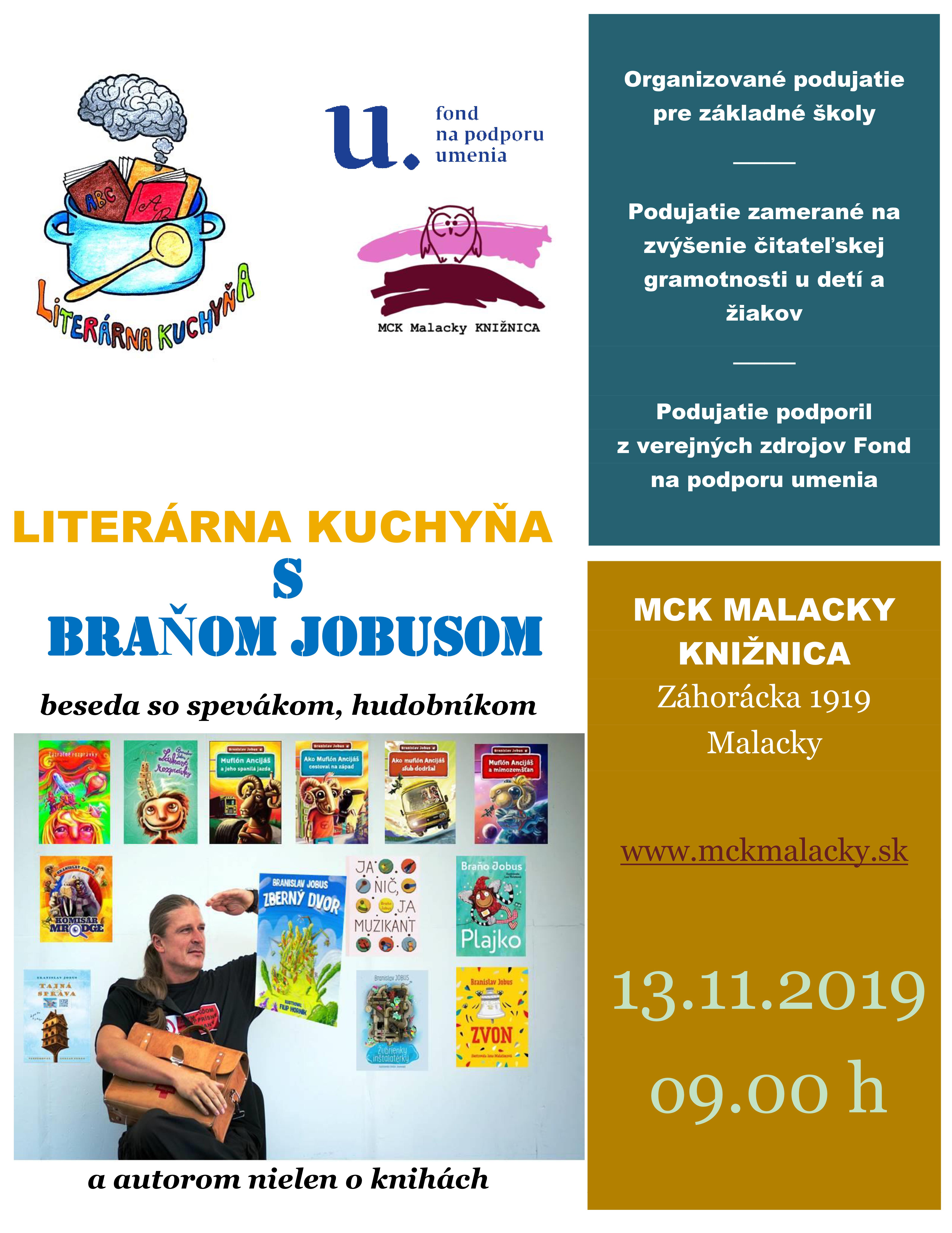Knižnica MCK Malacky v Literárnej kuchyni namiešala štvrtú jesennú výchovno-vzdelávaciu kašu, ktorá podporuje čitateľskú gramotnosť, čiže trávenie kníh u detí a mládeže a ich záujem o literatúru. Pripravili sme pre žiakov organizované stretnutie so spisovateľom , hudobníkom a spevákom Braňom Jobusom. Budeme sa rozprávať nielen o knihách....
