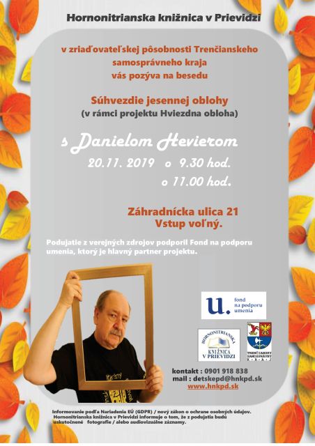 Hornonitrianska knižnica v Prievidzi vás pozýva v stredu 20. 11. 2019 o 9.30 hod. a o 11.00 hod. na stretnutie so vzácnym hosťom, známym spisovateľom Danielom Hevierom. Celý rok sme si pozývali hostí podľa znamení zverokruhu. Daniel Hevier nám zavŕši našu ,,Hviezdu oblohu" svojim znamením. Verí na horoskopy? Ovplyvňuje ho jeho znamenie zverokruhu? Tešíme sa na záverečné stretnutie projektu Hviezdna obloha.