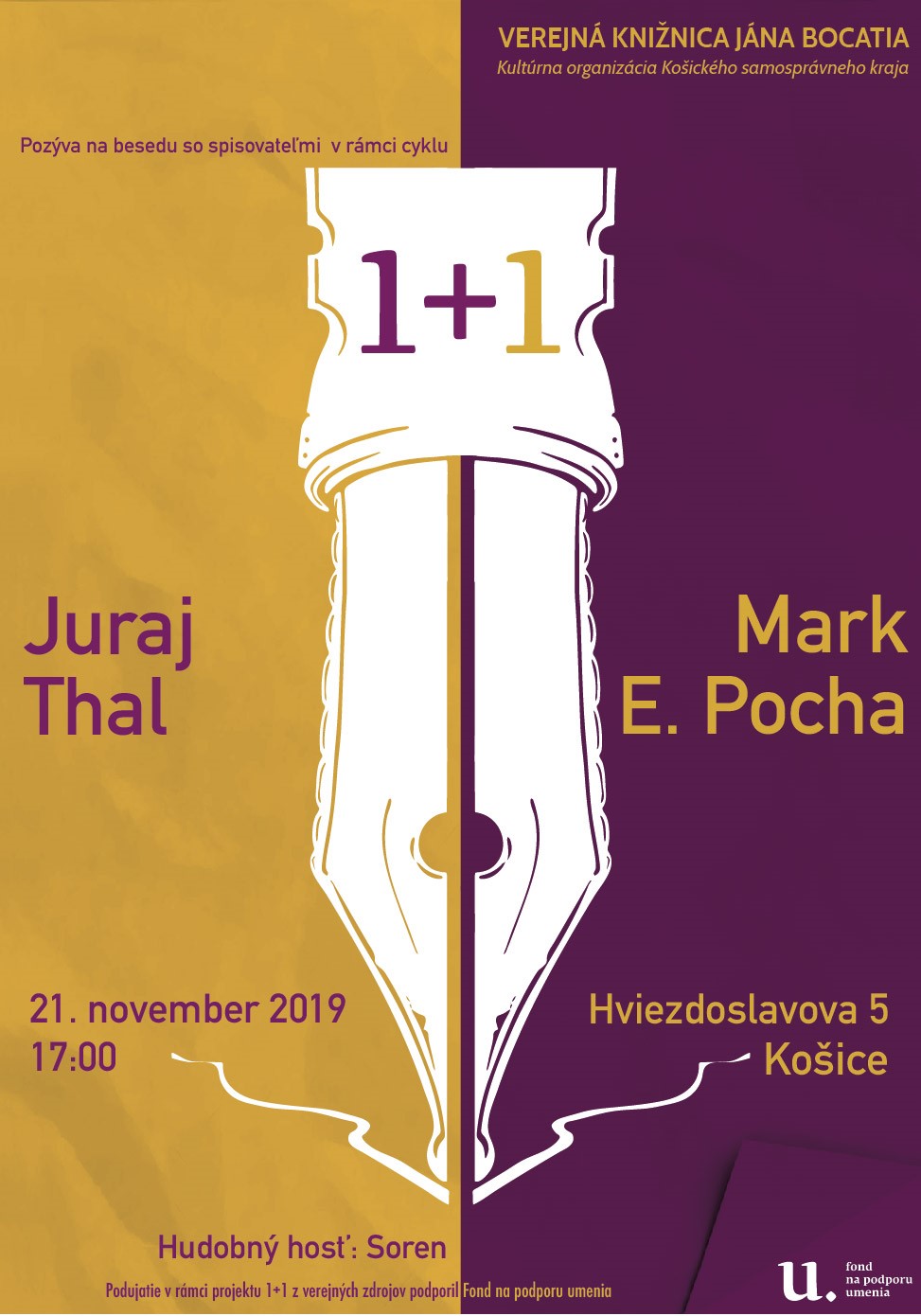 Novembrovú sychravosť a chlad môžu návštevníci Verejnej knižnice Jána Bocatia v Košiciach (VKJB) prežívať ešte intenzívnejšie vďaka spisovateľom Jurajovi Thalovi a Mark E. Pochovi. Autorov kníh, z ktorých behá mráz po chrbte a tuhne krv v žilách, privíta knižnica v rámci obľúbeného cyklu besied 1+1. Podujatie sa bude konať vo štvrtok 21. novembra 2019 o 17:00 v centrálnej požičovni na Hviezdoslavovej ul. 5. Hudobným hosťom podujatia bude už tradične skupina Soren.