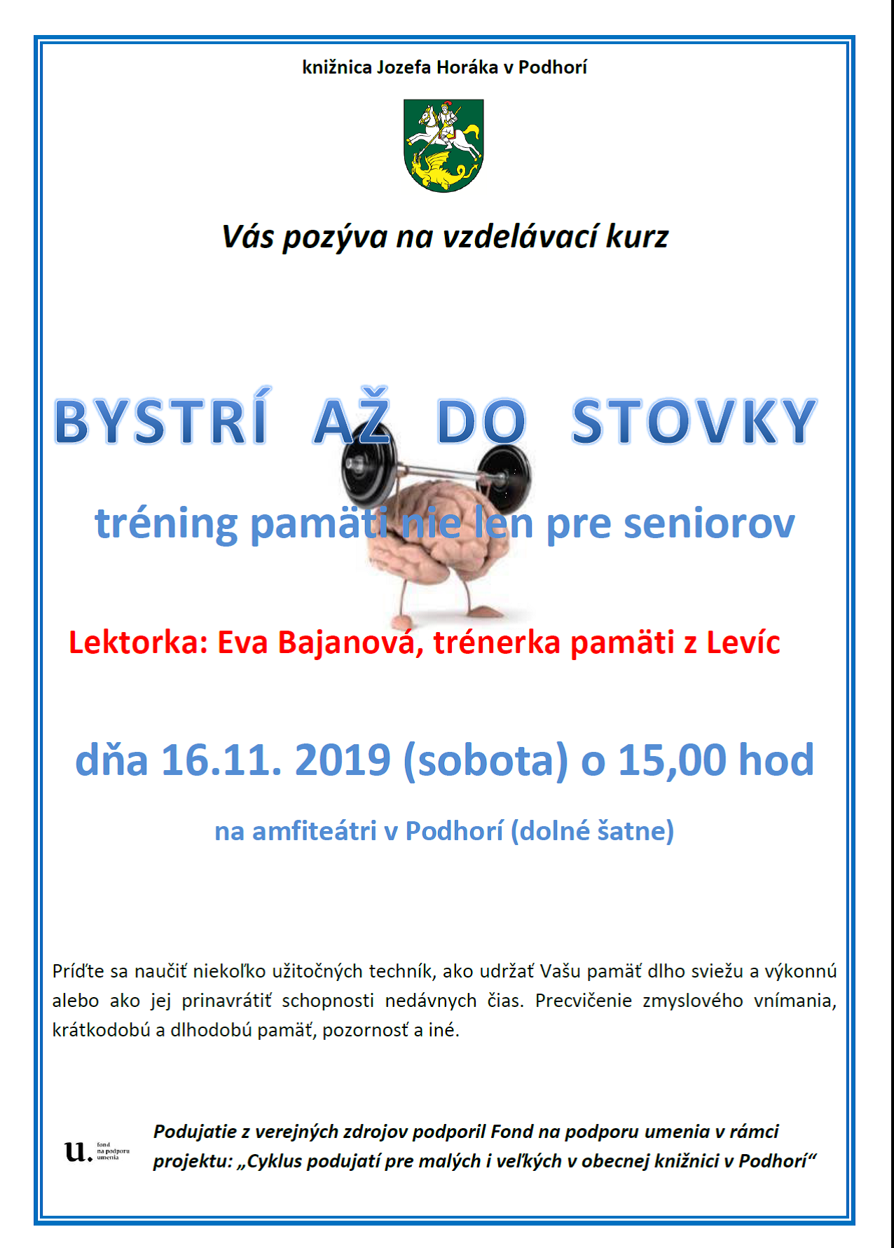 Knižnica Jozefa Horáka v Podhorí organizuje tréning pamäti, ktorí je určení pre mladých pre starších. Lektorkou je pani Eva Bajanová, skúsená lektorka z Levíc v oblasti vzdelávania.