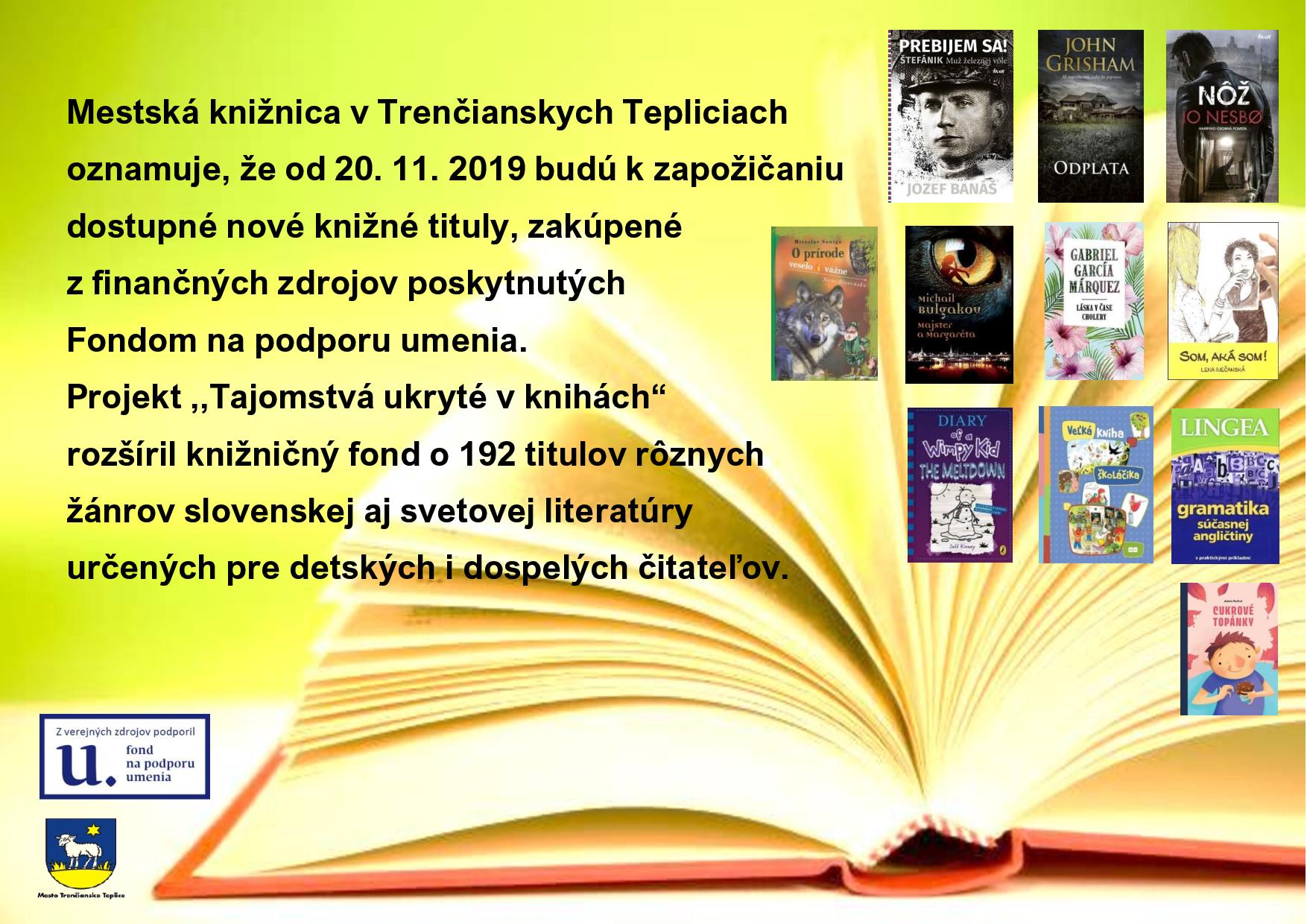 Zámerom projektu ,,Tajomstvá ukryté v knihách" je rozšírenie knižničného fondu v Mestskej knižnici v Trenčianskych Tepliciach o nové knižné tituly. Pre udržanie záujmu zo strany verejnosti a zároveň zvyšovania návštevnosti, je dôležité reflektovať na dopyt a potreby čitateľov a prispôsobovať tomu aj ponuku knižných titulov. Realizáciou projektu očakávame nárast čitateľov v rámci cieľových skupín, ako aj zvýšenie výpožičiek a zatraktívnenie služieb.