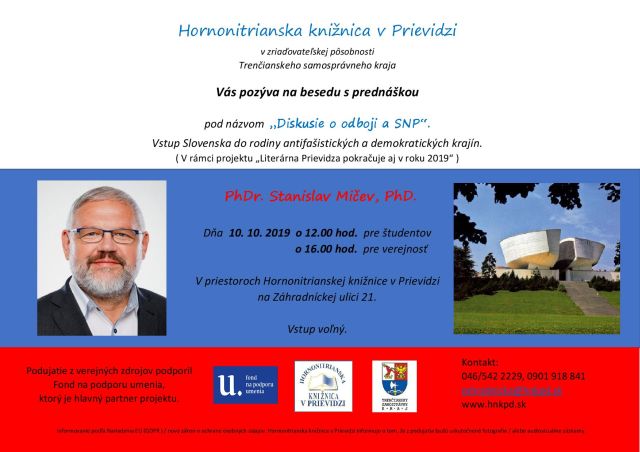 Pred 75 rokmi, počas SNP išlo o všetko, čo je nám drahé a vzácne. O právo na život, právo na slobodu, právo na národnú a štátnu existenciu. Hornonitrianska knižnica v Prievidzi vás pozýva na prednášku – besedu : „Diskusie o odboji a SNP – Vstup Slovenska do rodiny antifašistických a demokratických krajín“.