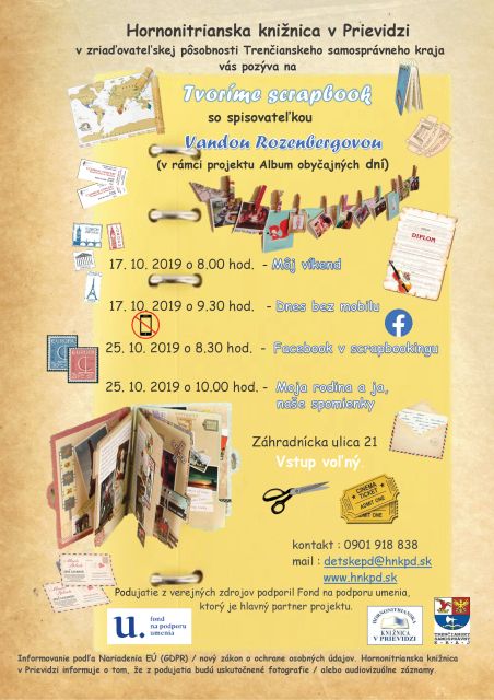 Album obyčajných dní/ Tvoríme scrapbook/. Priestory nášho knižničného divadielka ponúkajú veľa možností na využitie techniky scrapbookingu - ako tvorivo a s hmatateľným výsledkom stráviť dopoludnie v knižnici. Čo je to scrapbook ? To si prídu vyskúšať žiaci ZŠ a študenti Praktickej školy v Prievidzi s lektorkou Mgr. Vandou Rozenbergovou v dňoch: 17.10. 2019 a 25.10.2019.