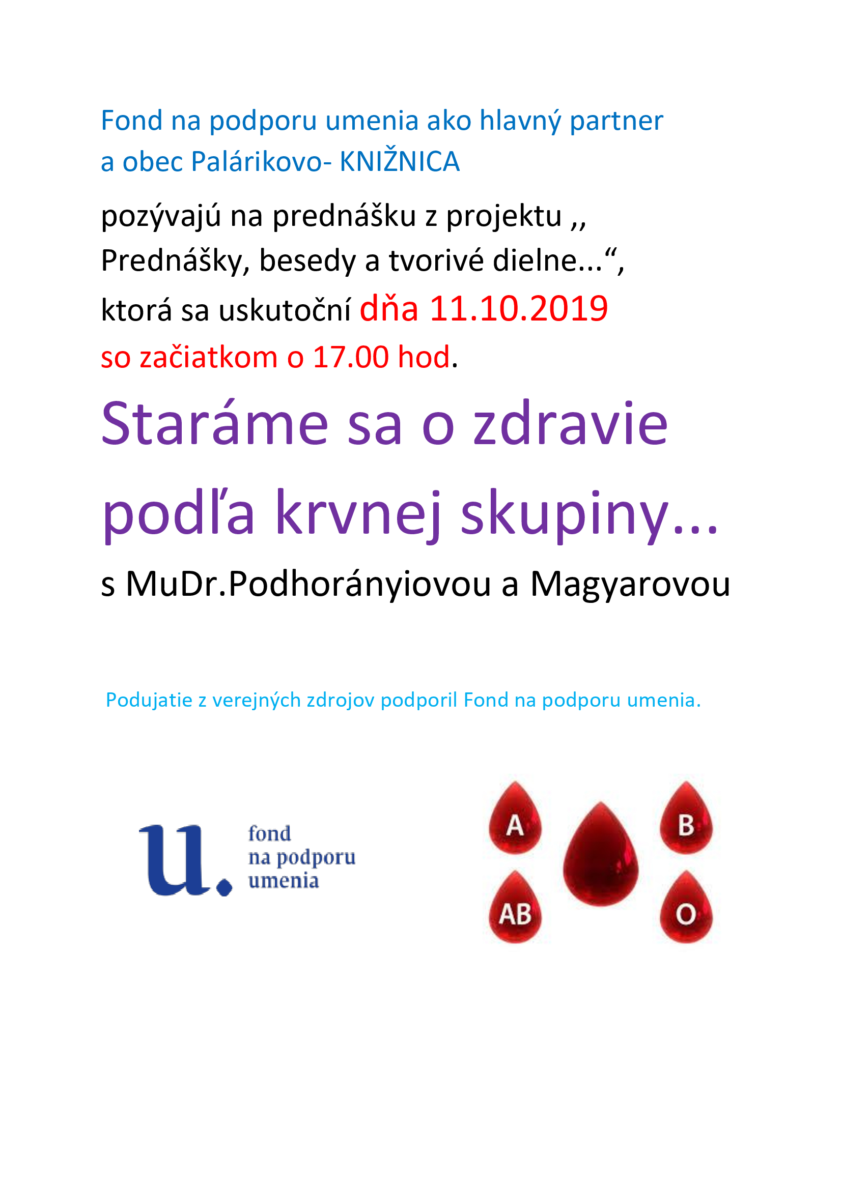 V priestoroch knižnice sa dňa 11.10.2019 so začiatkom o 17.00 hod uskutoční prednáška s Mudr. Podhorányiovou a Magyarovou pod názvom Staráme sa o svoje zdravie podľa krvných skupín...