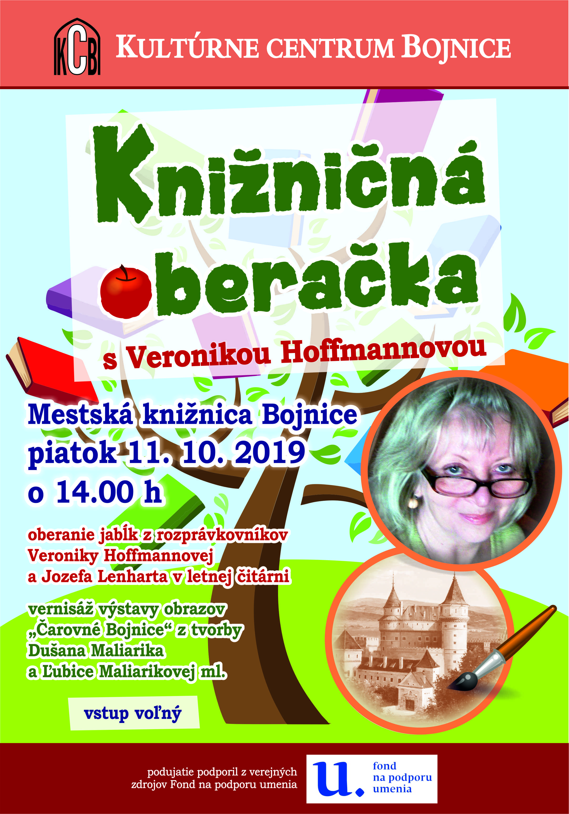 Beseda s bojnickou autorkou Veronikou Hoffmannovou, ktorá ponúkne deti čítaním rozprávkových príbehov a jabĺčkami zo svojho rozprávkovníka v knižničnej záhrade. Podujatie podporil z verejných zdrojov Fond na podporu umenia.