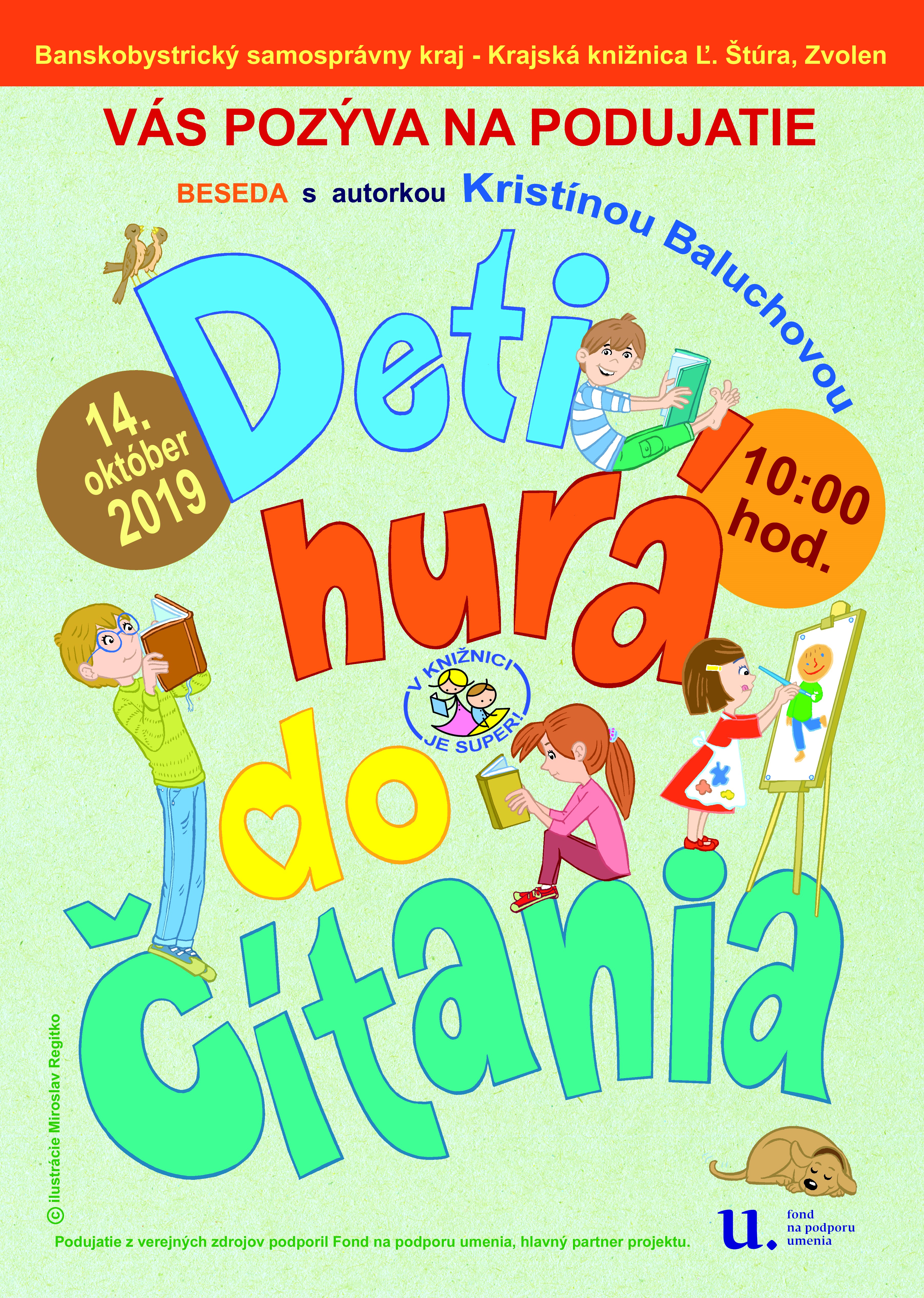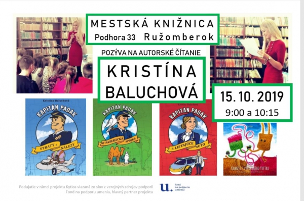 Beseda so slovenskou autorkou kníh pre deti Kristínou Baluchovou je organizovaná v rámci cyklu podujatí pre deti Deti hura do čítania, ktorý je súčasťou projektu V knižnici je super! Projekt z verejných zdrojov podporil Fond na podporu umenia ako hlavný partner projektu.