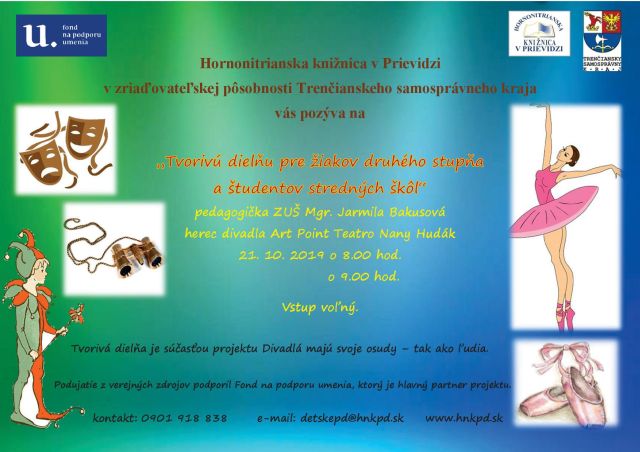 V pondelok, 21. októbra 2019, sa zásluhou pedagóga ZUŠ Ladislava Stančeka - Mgr. Jarmily Bakusovej a herca Art Piont Teatro - Nanyho Hudáka priblížime o kúsok bližšie k tohtoročnému oslávencovi - k divadlu. Veľa slov a tvorivá aktivita budú v tento deň sprevádzať účastníkov počas dvoch workshopov.