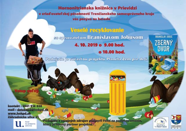 Spisovateľ Branislav Jobus sebe vlastným humorom v knihe s názvom Zberný dvor približuje problematiku vzniku prebytočného odpadu, jeho následného triedenia a spracovania. Táto problematika a životné prostredie nie je ľahostajné ani nám v knižnici, a preto sa mu v rámci projektu Planéta Zem pre deti aktívne venujeme. Na záverečné podujatie z tohto projektu prijal naše pozvanie 4. 10. 2019 o 9.00 hod. a 10.00 hod. spisovateľ Branislav Jobus.