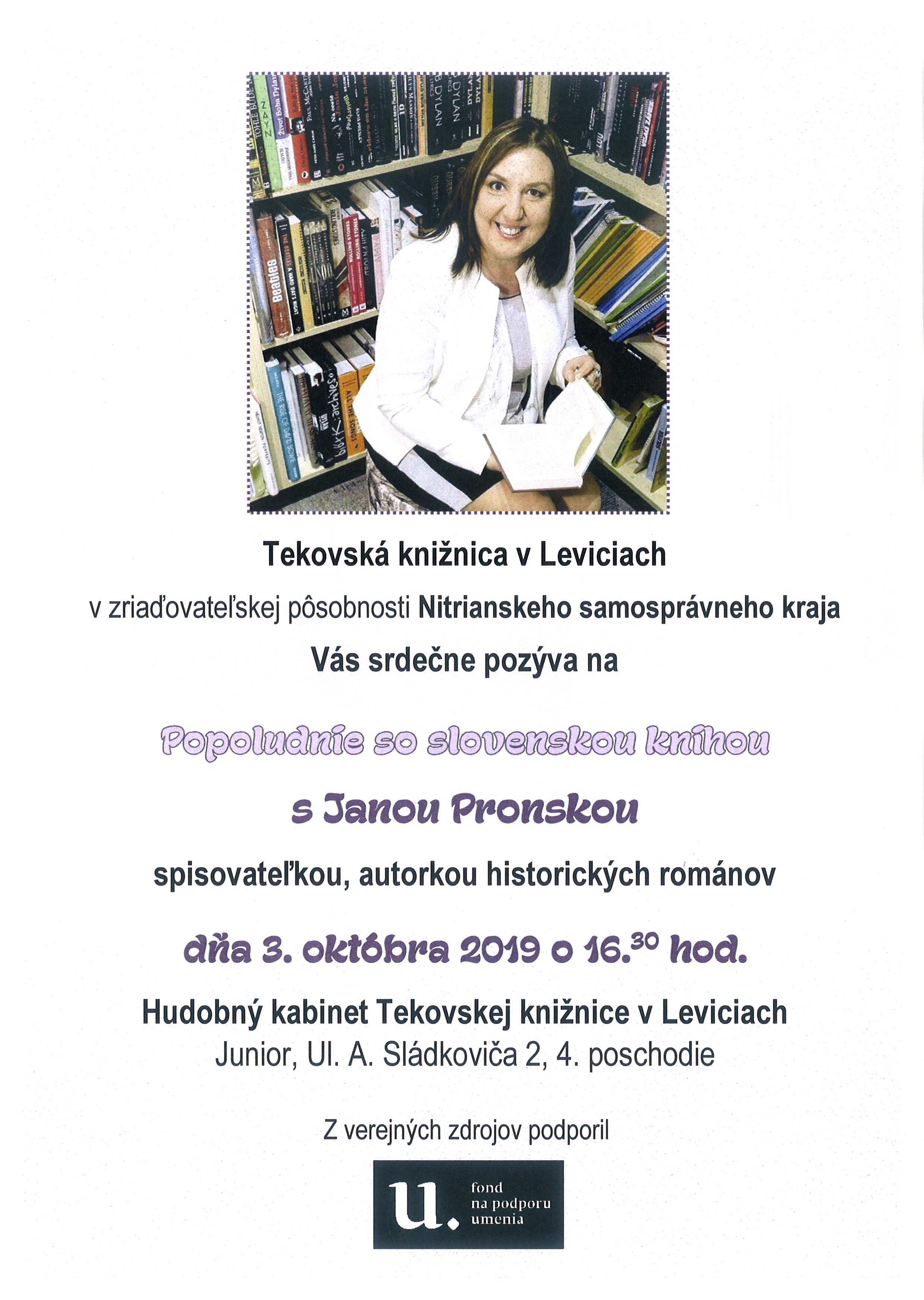 Druhá časť projektu Knižnica "dospelákom" je venovaná tvorbe slovenských autorov, ktorí sa v knižnici stretávajú na autorských besedách so svojimi čitateľmi. Tretím hosťom v rámci projektu bude autorka historických romancí pani Jana Pronská.