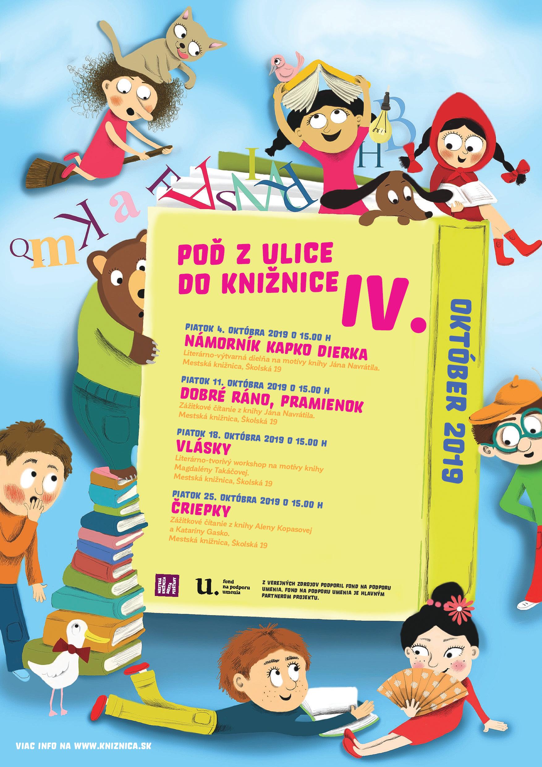 Projektom Poď z ulice do knižnice IV. chceme u detí v predškolskom a školskom veku podporiť osvojenie si čitateľských zručností. V spolupráci s rodičmi a cez zaujímavé aktivity chceme prispieť k budovaniu pozitívneho vzťahu detí ku knihe a položiť základy ich celoživotného vzdelávania. Ústrednými aktivitami sú: cyklus podujatí Zahrajme sa s knižkou, Číta a tvorí celá rodina, Učíme sa čítať knihy, Interaktívne dramatizácie, Úlet s knihou/Uleť s knihou, výtvarná súťaž pre žiakov MŠ a iné.
