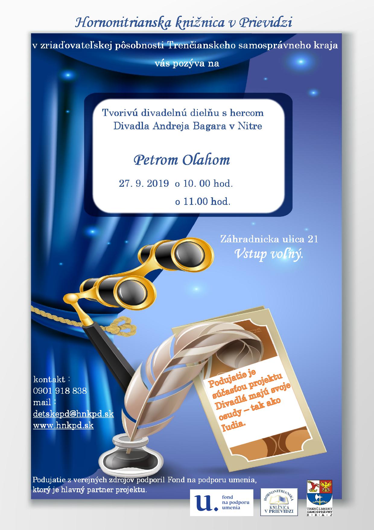 Tvorivé dielne s hercom Divadla Andreja Bagara v Nitre - Mgr. Art. PETROM OLAHOM. Pracovať i rozprávať sa budeme 27. septembra 2019 o 10.00 a 11.00 hod. v divadielku Hornonitrianskej knižnice v Prievidzi.