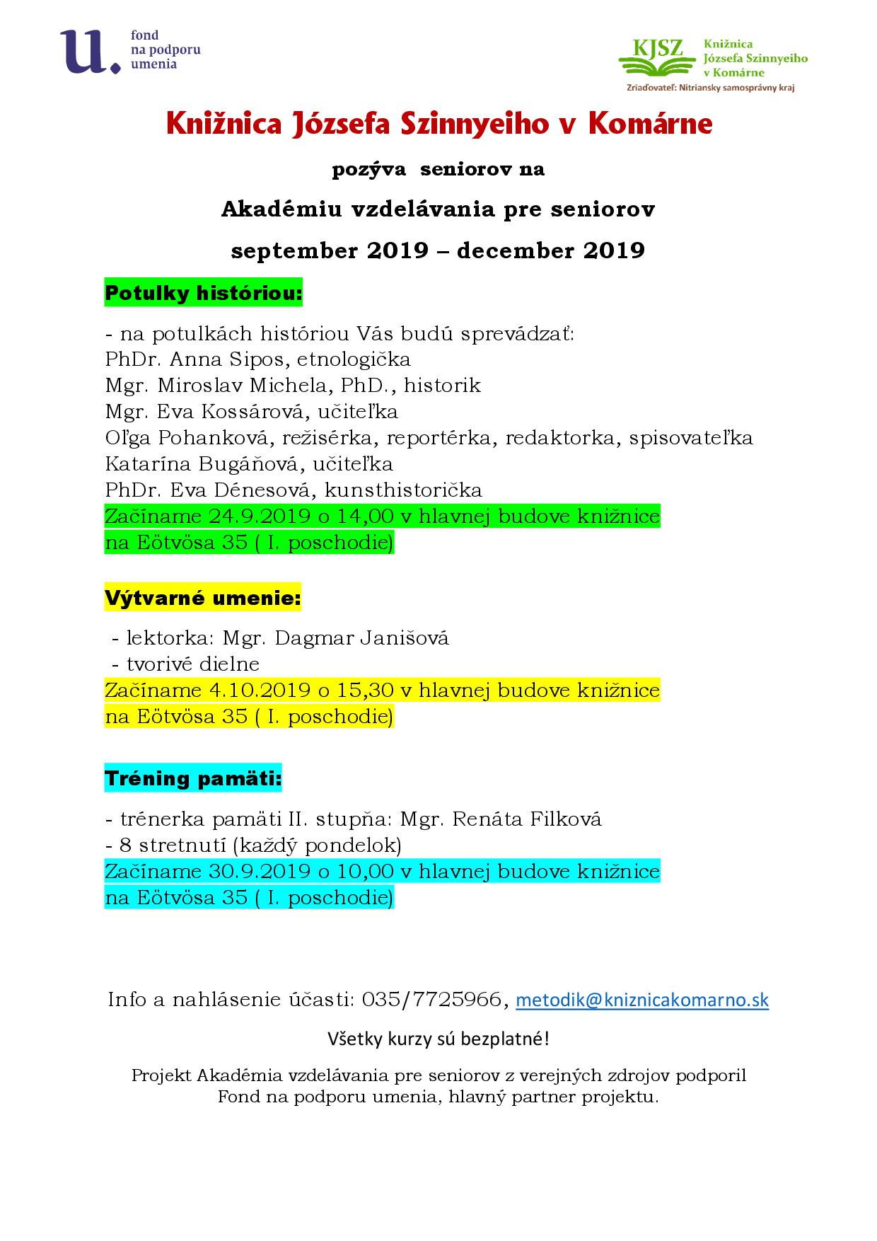 Akadémia vzdelávania pre seniorov je záujmové štúdium. Ponúkame tri kurzy: Potulky históriou, Výtvarné umenie - tvorivé dielne, Tréningy pamäti.