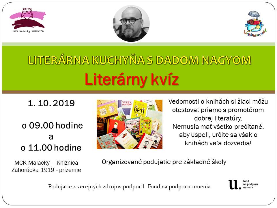 Knižnica MCK Malacky v Literárnej kuchyni namiešala druhú jesennú výchovno-vzdelávaciu kašu, ktorá podporuje čitateľskú gramotnosť, čiže trávenie kníh u detí a mládeže a ich záujem o literatúru. Pripravili sme pre žiakov organizované stretnutie s Dadom Nagyom. Vedomosti o knihách si žiaci môžu otestovať priamo s promotérom dobrej literatúry. Nemusia mať všetko prečítané, aby uspeli, určite sa však o knihách veľa dozvedia!
