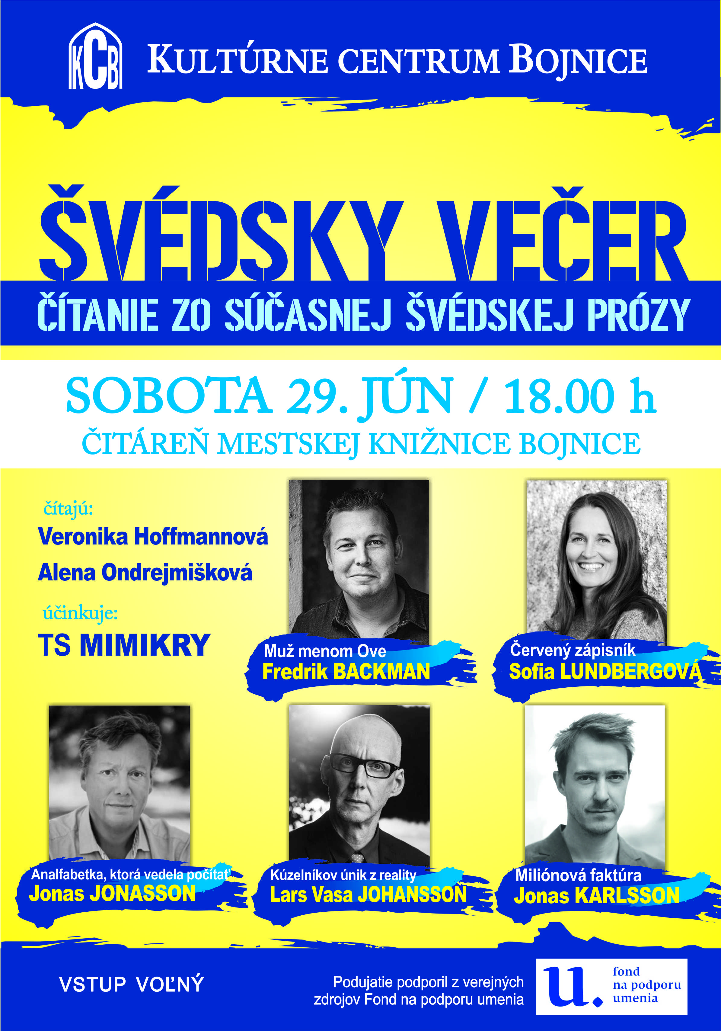 Mrazivé detektívky zo severu určite poznáte... No Švédi sa vedia smiať sami zo seba a poznajú sebairóniu... Príďte si vypočuť ukážky zo súčasnej švédskej prózy. Tešíme sa na vás... Podujatie podporil z verejných zdrojov Fond na podporu umenia.