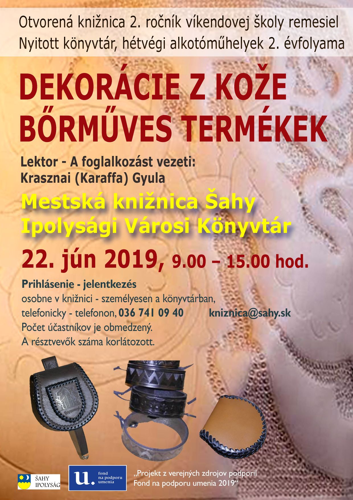 Praktický kurz remesiel pre dospelých - dekorácie z kože. Prednáška o pôvodnom spracovaní kože, o výrobe úžitkových a dekoračných predmetov v domácnosti. Praktická ukážka výroby - výroba náramku, peňaženky a peračníka.