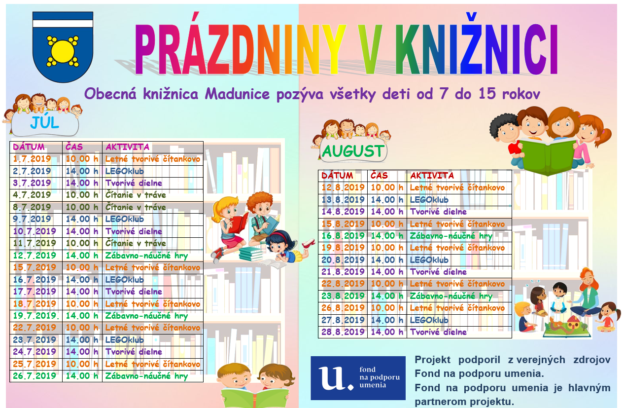 Obecná knižnica Madunice bude počas letných prázdnin 2019 realizovať 32 aktivít pre deti od 7 do 15 rokov. Budú sa striedať podujatia Letné tvorivé čítankovo, Čítanie v tráve, Zábavno-náučné hry, Tvorivé dielne a Legoklub.