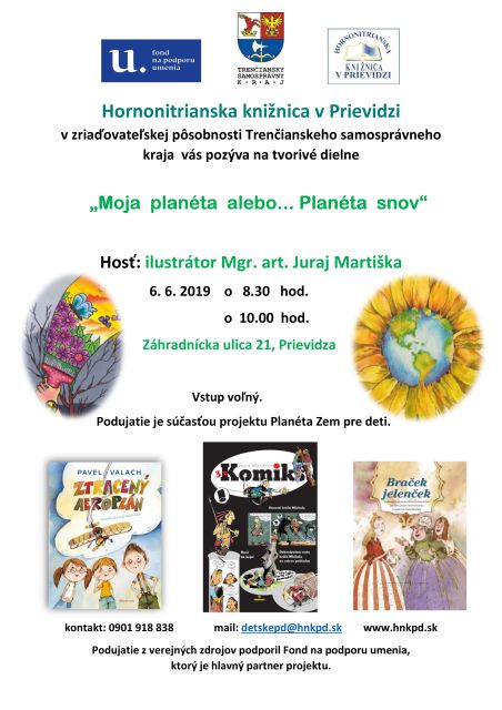 Cieľom projektu je vytvoriť citlivejší prístup detí k rovnováhe na našej planéte. Ilustrátor, Mgr. art. Juraj Martiška, pomôže 6. júna 2019 počas dvoch podujatí deťom spoluvytvoriť planétu – svoju planétu, ideálnu pre život. Buď podľa vlastných predstáv, planétu svojich snov, alebo našu Zem, ktorú skúsia zachrániť - obnoviť ( zatiaľ aspoň na výkrese). Veď každý môžeme prispieť k tomu, aby naša matka Zem nezahynula a my s ňou.