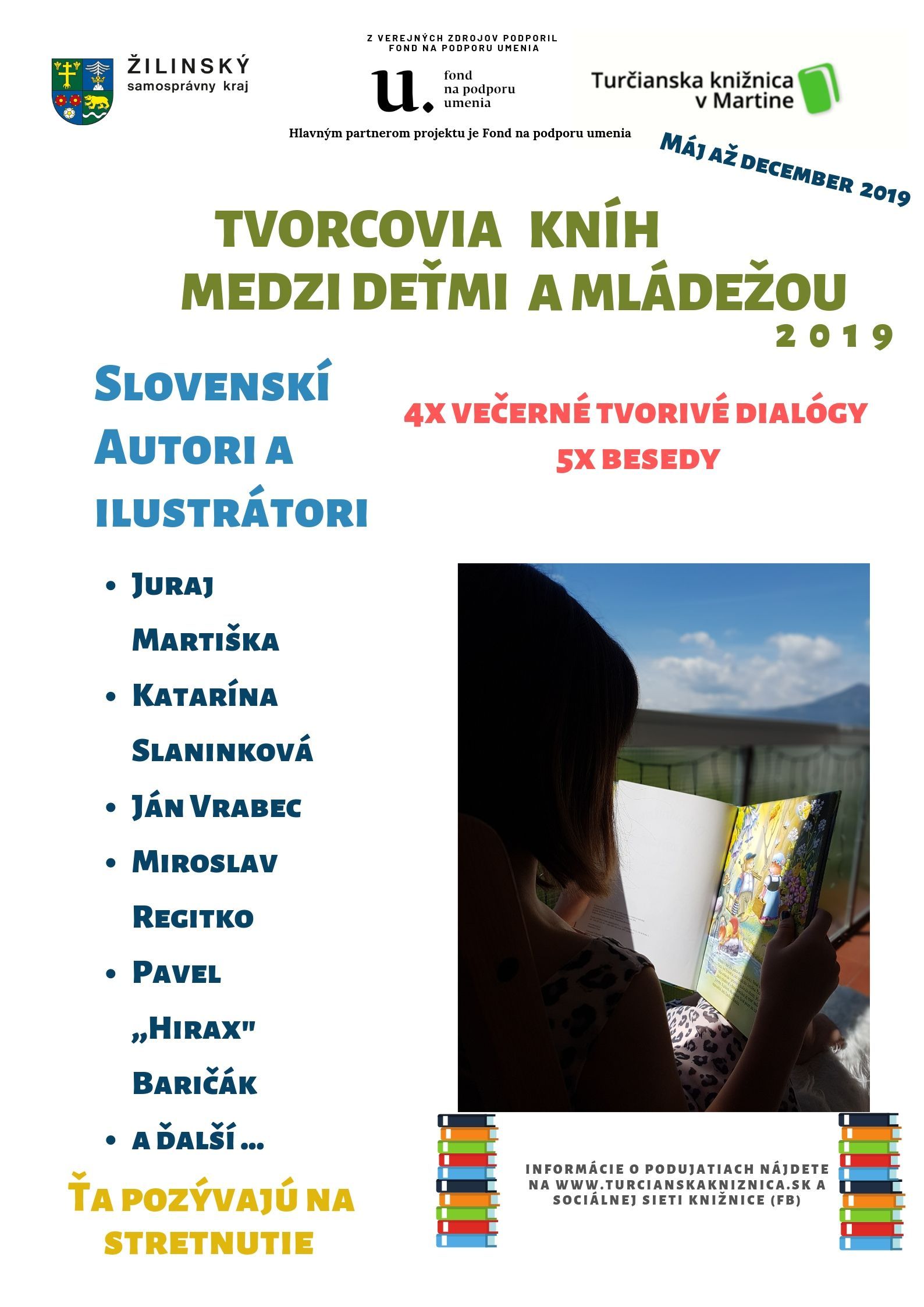 V rámci projektu Tvorcovia medzi deťmi a mládežou 2019 pokračujeme v sérii Večerných tvorivých dialógov na tému Jeseň. V októbrový podvečer 25.10.2019 u nás privítame známeho ilustrátora Miroslava Regitka. Taktiež budeme pokračovať s besedami so spisovateľmi detských kníh. Už 25.9.2019 k nám zavíta obľúbená autorka detských kníh Silvia Havelková.