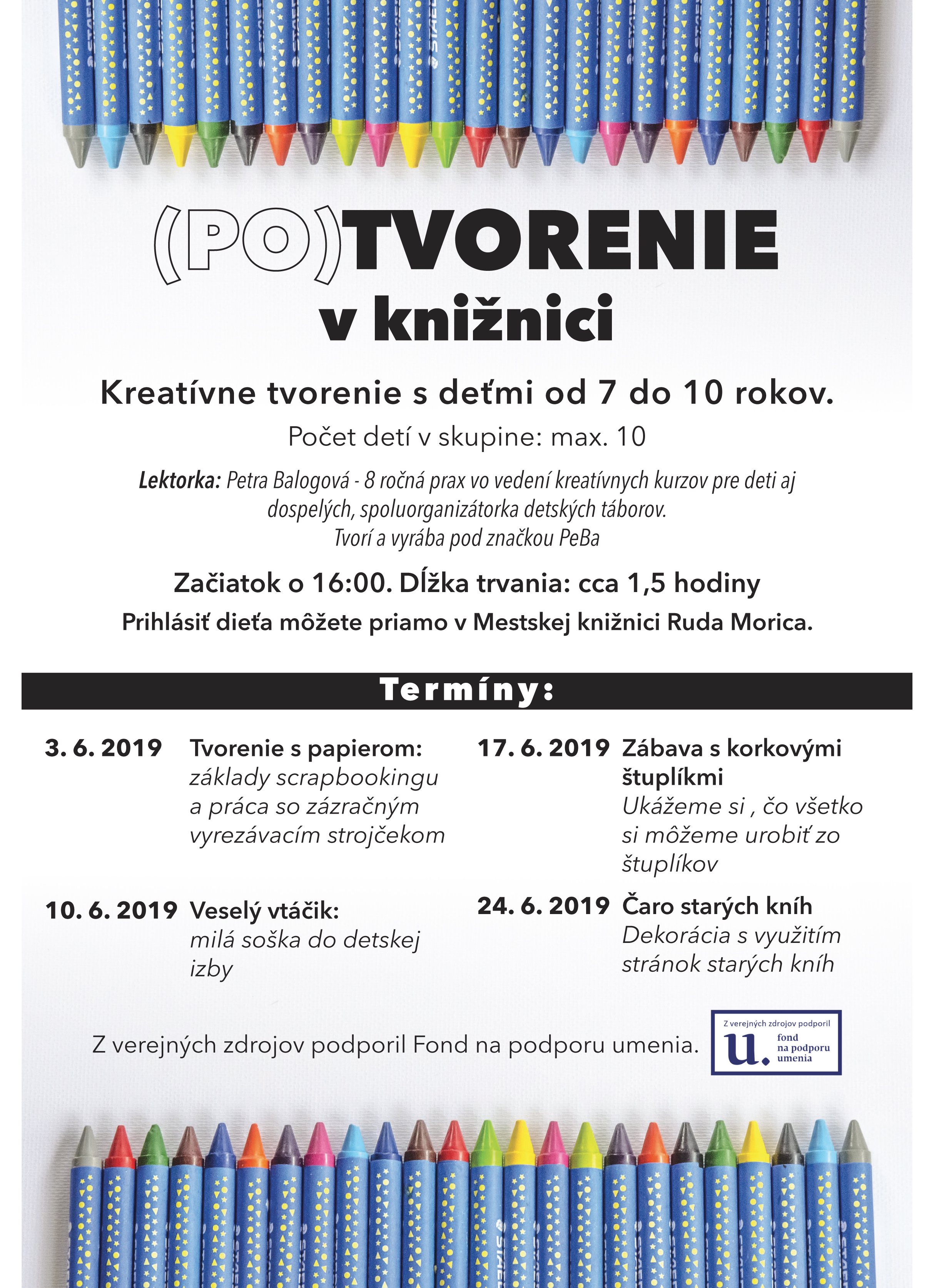 Kreatívne tvorenie s deťmi od 7 do 10 rokov. Počet detí v skupine: max. 10 Lektorka: Petra Balogová - 8 ročná prax vo vedení kreatívnych kurzov pre deti aj dospelých, spoluorganizátorka detských táborov. Tvorí a vyrába pod značkou PeBa