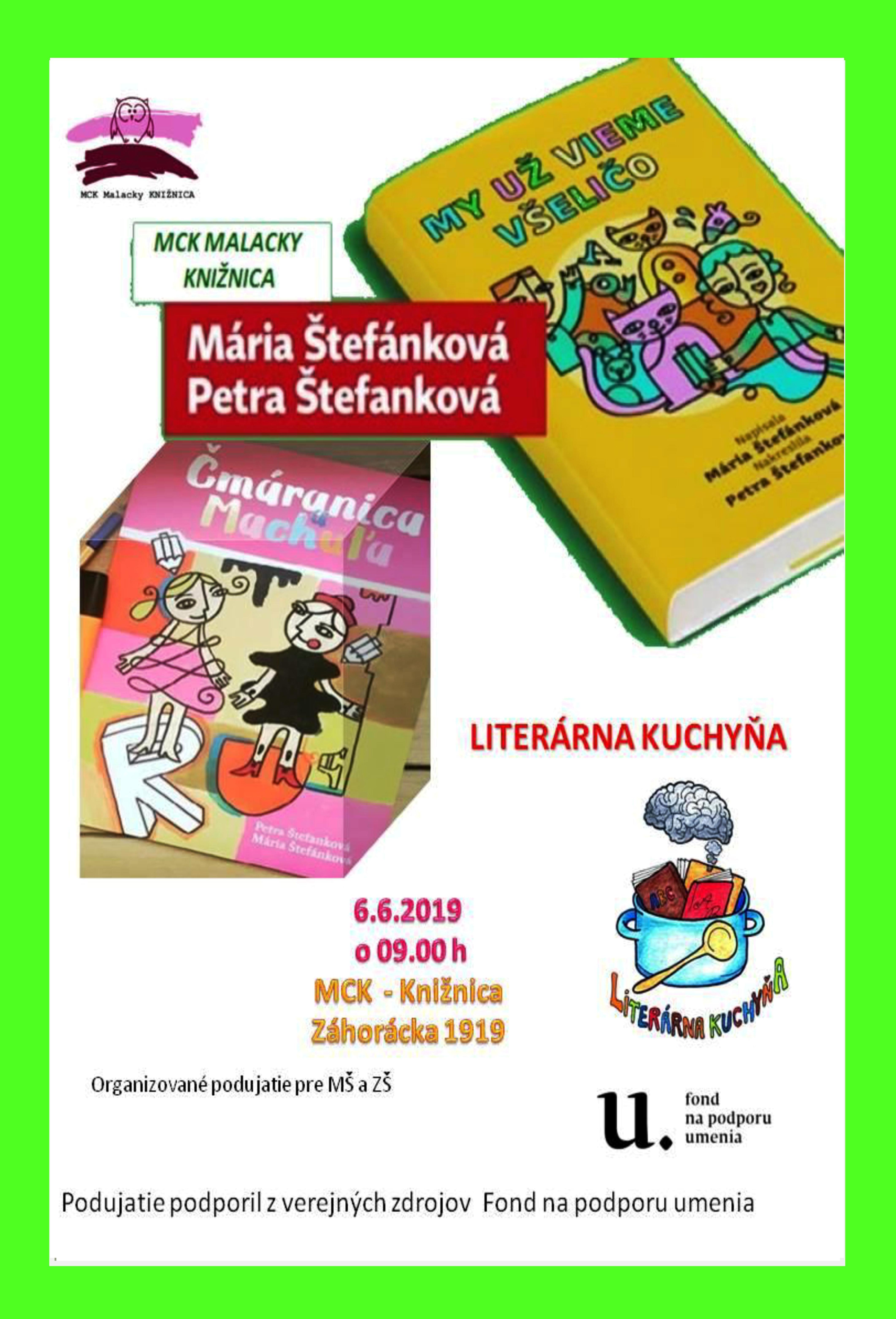 Knižnica MCK Malacky v Literárnej kuchyni namiešala tohtoročnú štvrtú letnú výchovno-vzdelávaciu kašu, ktorá podporuje čitateľskú gramotnosť, čiže trávenie kníh u detí a mládeže a ich záujem o literatúru.Do našej kuchyne k nám zavíta spisovateľka Mária Štefánková a ilustrátorka detských kníh Petra Štefanková. Predstavia nám ich dve spoločné diela z vydavateľstva Slovart: My už vieme všeličo a Čmáranica a Machuľa.