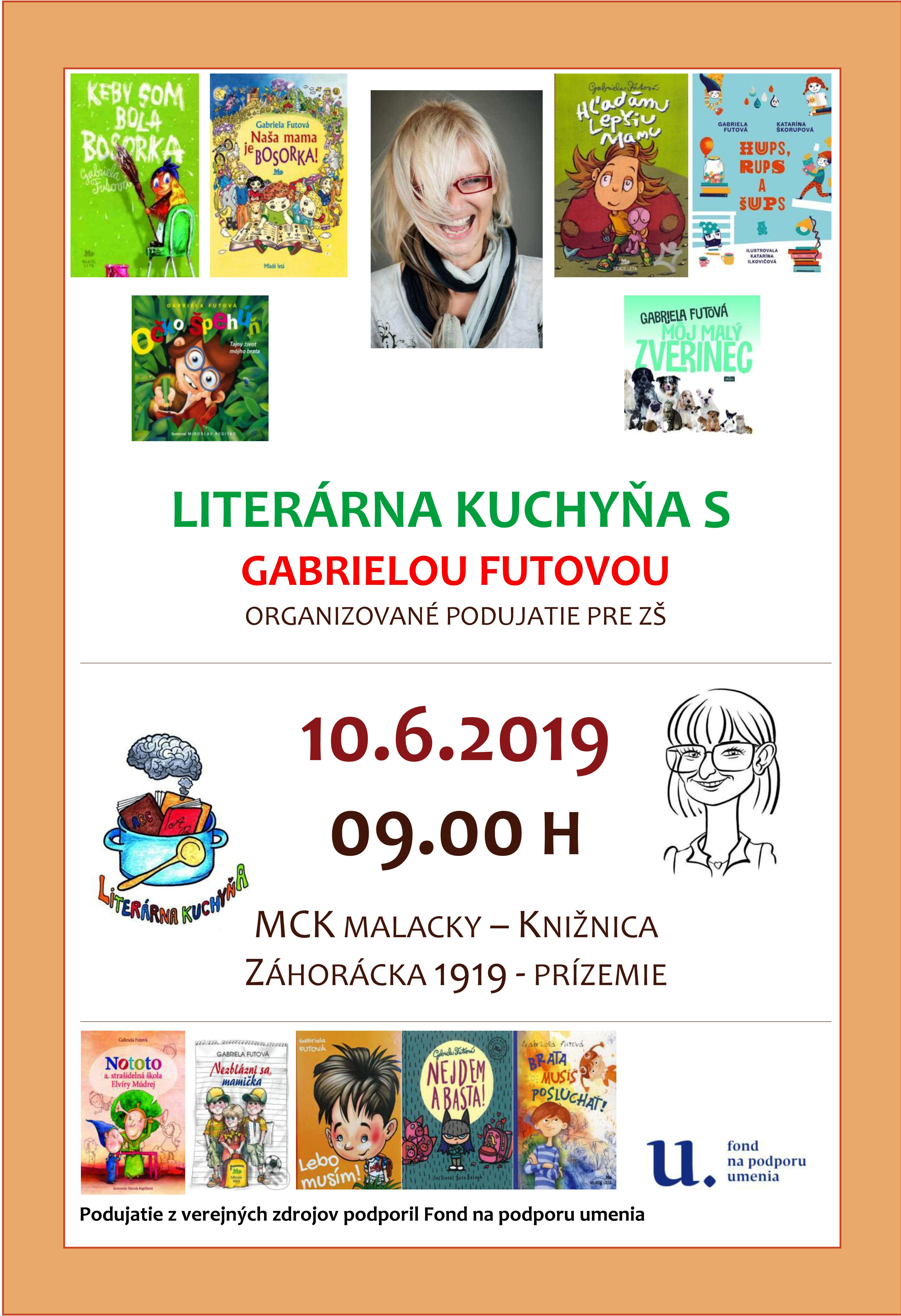 Knižnica MCK Malacky v Literárnej kuchyni namiešala tohtoročnú piatu letnú výchovno-vzdelávaciu kašu, ktorá podporuje čitateľskú gramotnosť, čiže trávenie kníh u detí a mládeže a ich záujem o literatúru.Do našej kuchyne k nám zavíta najobľúbenejšia detská spisovateľka Gabika Futová, ktorá nám porozpráva ako sa s pani knihovníčky stala pani spisovateľka. Predstaví nám svoju tvorbu a porozpráva nám zaujímavé príbehy s písania kníh.