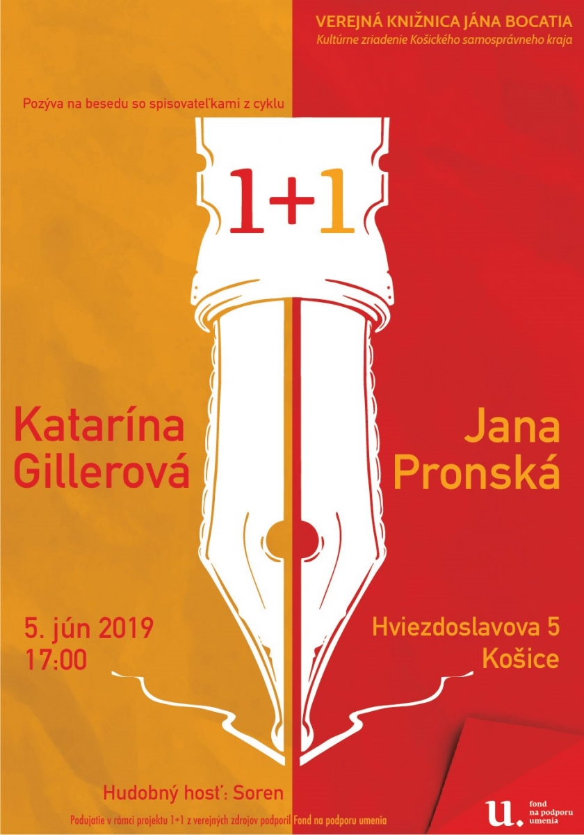 Autorky Katarína Gillerová a Jana Pronská patria medzi najúspešnejšie a najobľúbenejšie súčasné slovenské spisovateľky. Priaznivci sa s nimi môžu stretnúť vo Verejnej knižnici Jána Bocatia v Košiciach (VKJB), centrálnej požičovni na Hviezdoslavovej 5 v stredu 5. júna 2019 o 17:00. Podujatie je pokračovaním obľúbeného cyklu besied spisovateľov a ich hostí s názvom 1+1. Podujatie spestrí hudobná produkcia v podaní skupiny Soren.